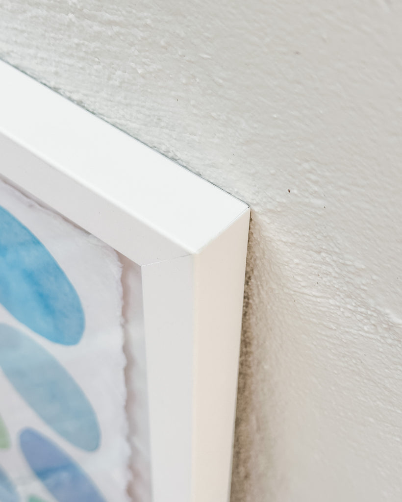 watercolor and gouache on handmade paper, floating on white mat in white frame