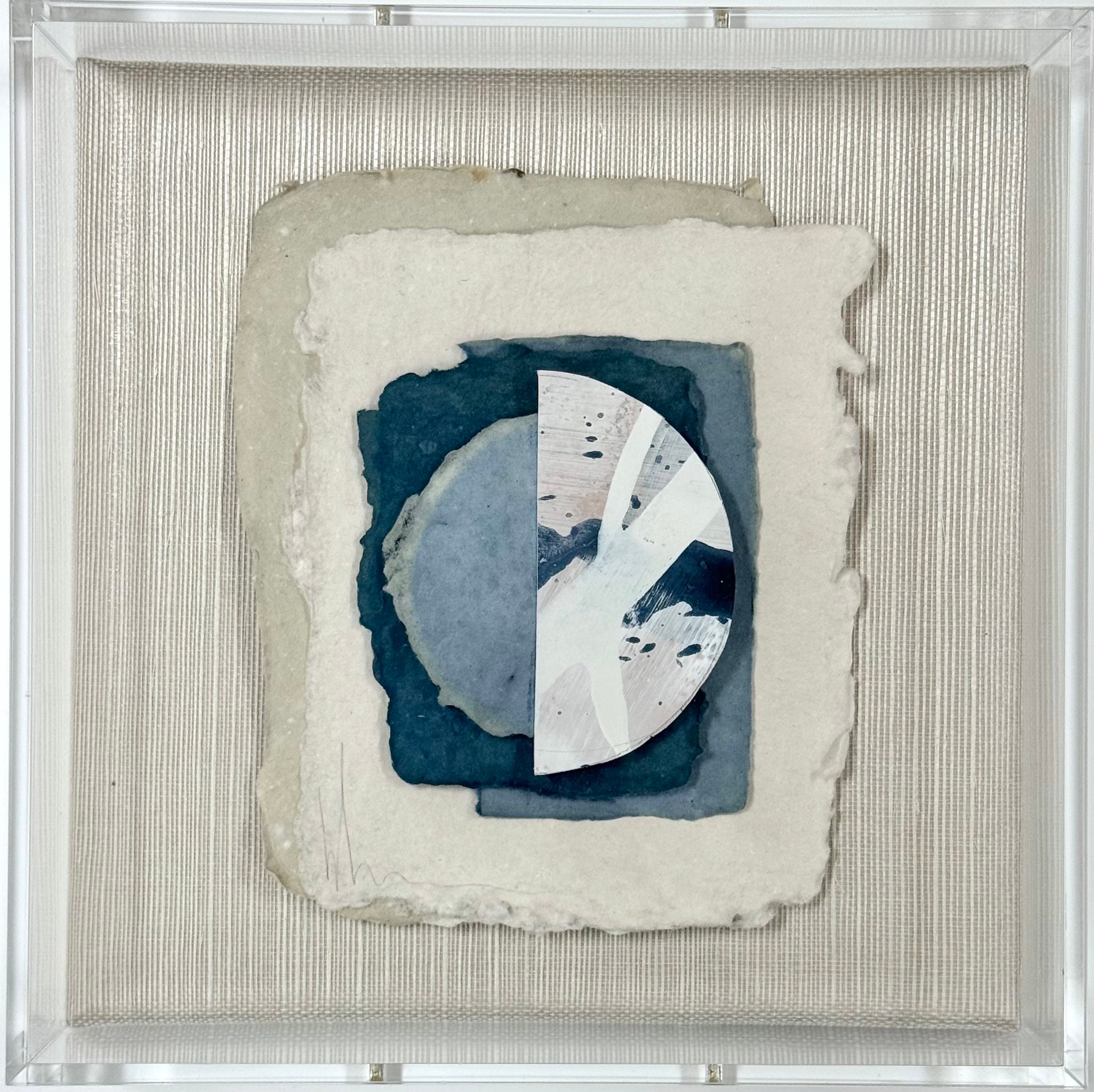 mixed media on handmade paper collage in shadow box frame with grasscloth backing