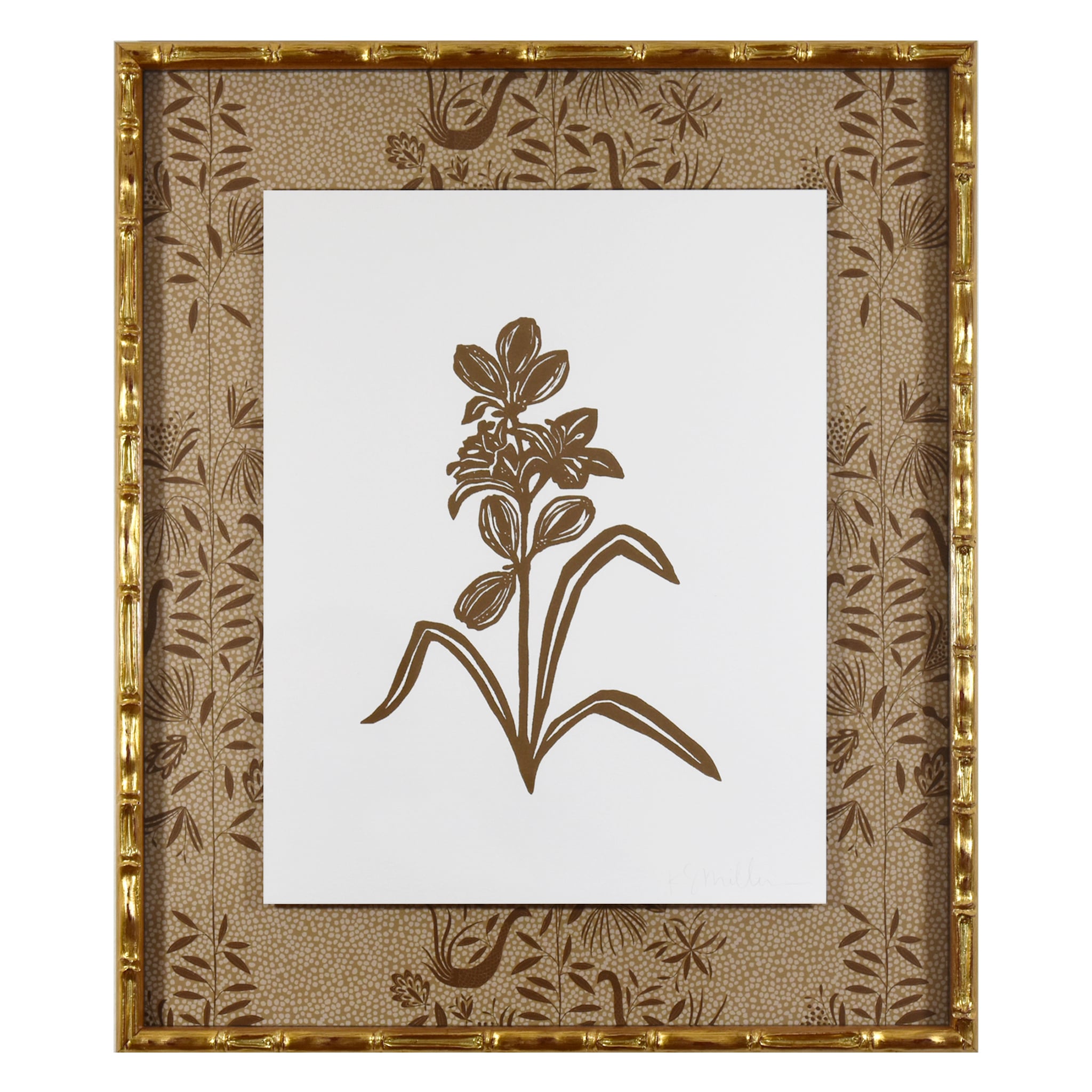hand carved and hand printed linocut floating on garden vine wallpaper, framed in gold bamboo frame
