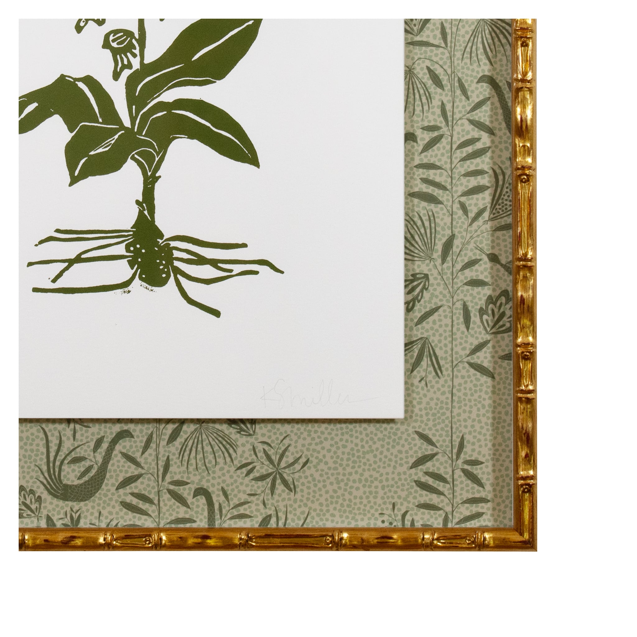 hand carved and hand printed linocut floating on garden vine wallpaper, framed in gold bamboo frame