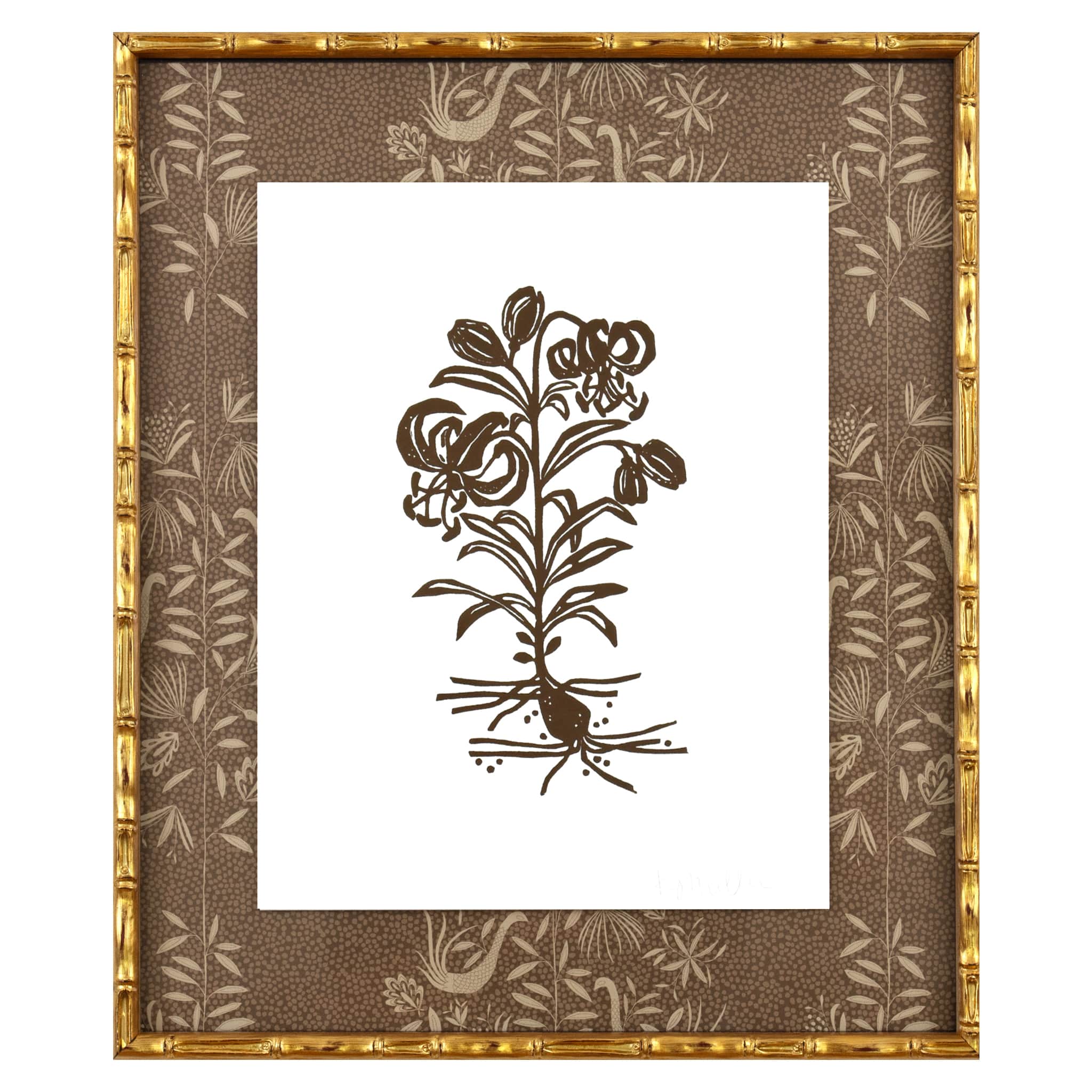 hand carved and hand printed linocut floating on garden vine wallpaper, framed in gold bamboo frame