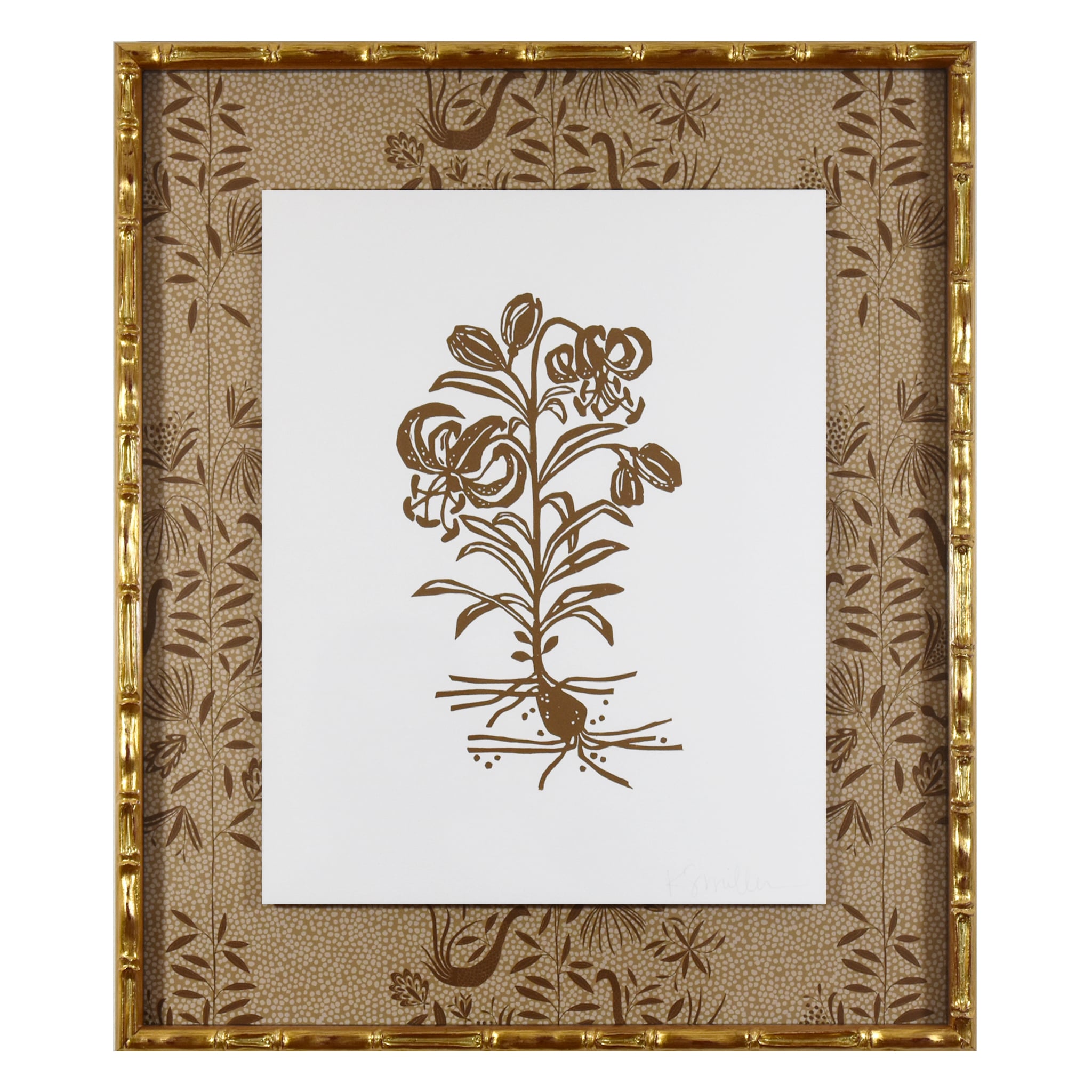 hand carved and hand printed linocut floating on garden vine wallpaper, framed in gold bamboo frame