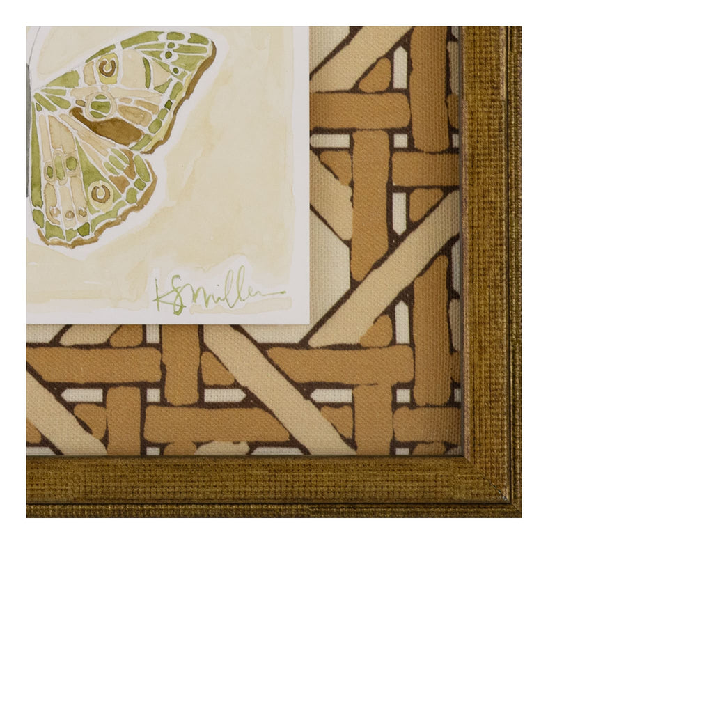watercolor and gouache floating on linen fabric, framed in gold wood frame