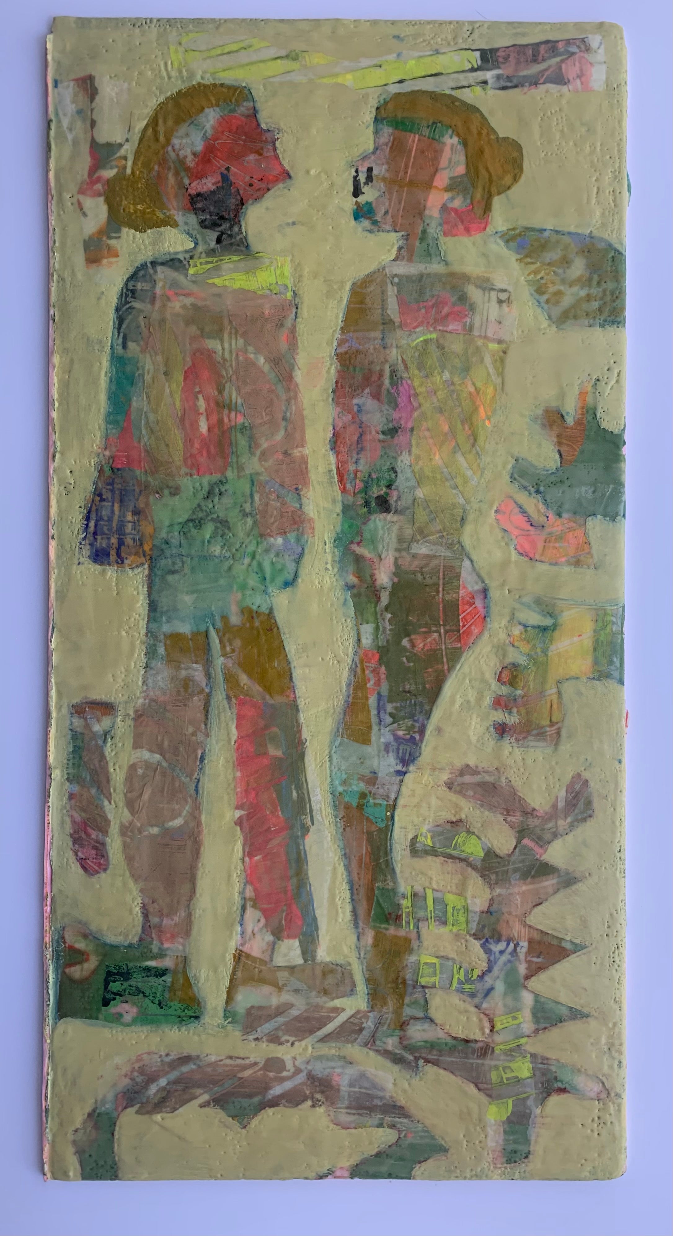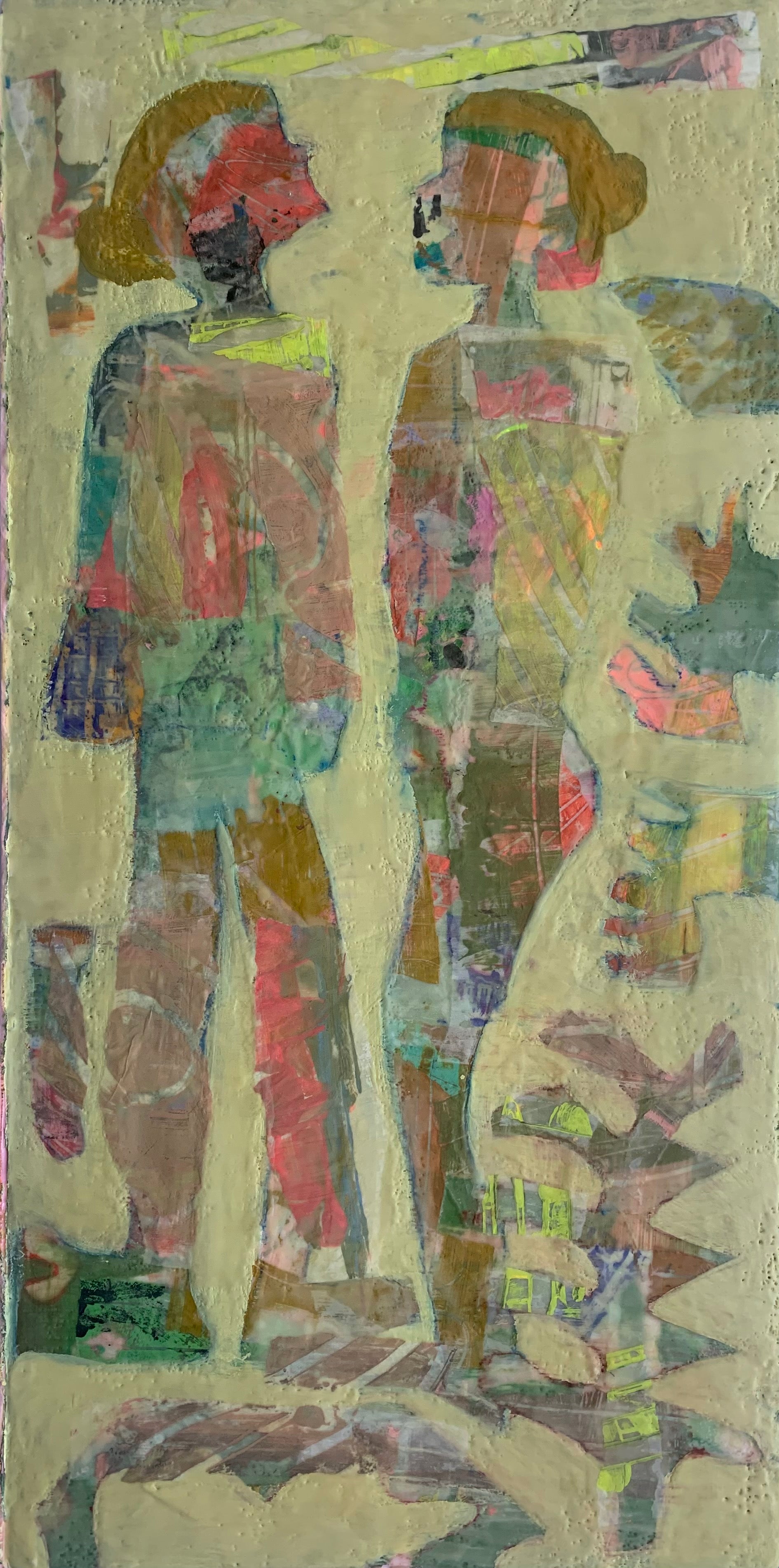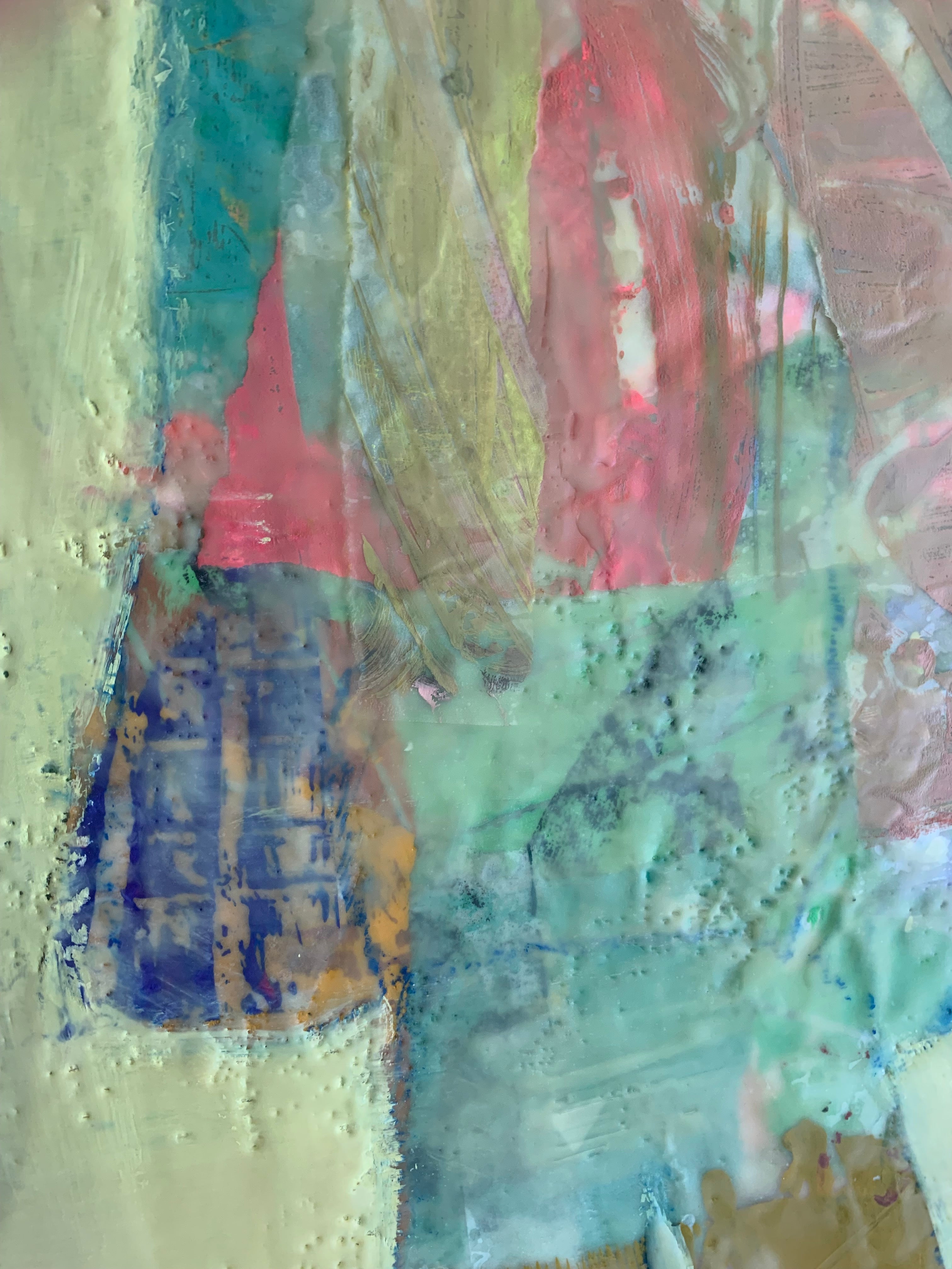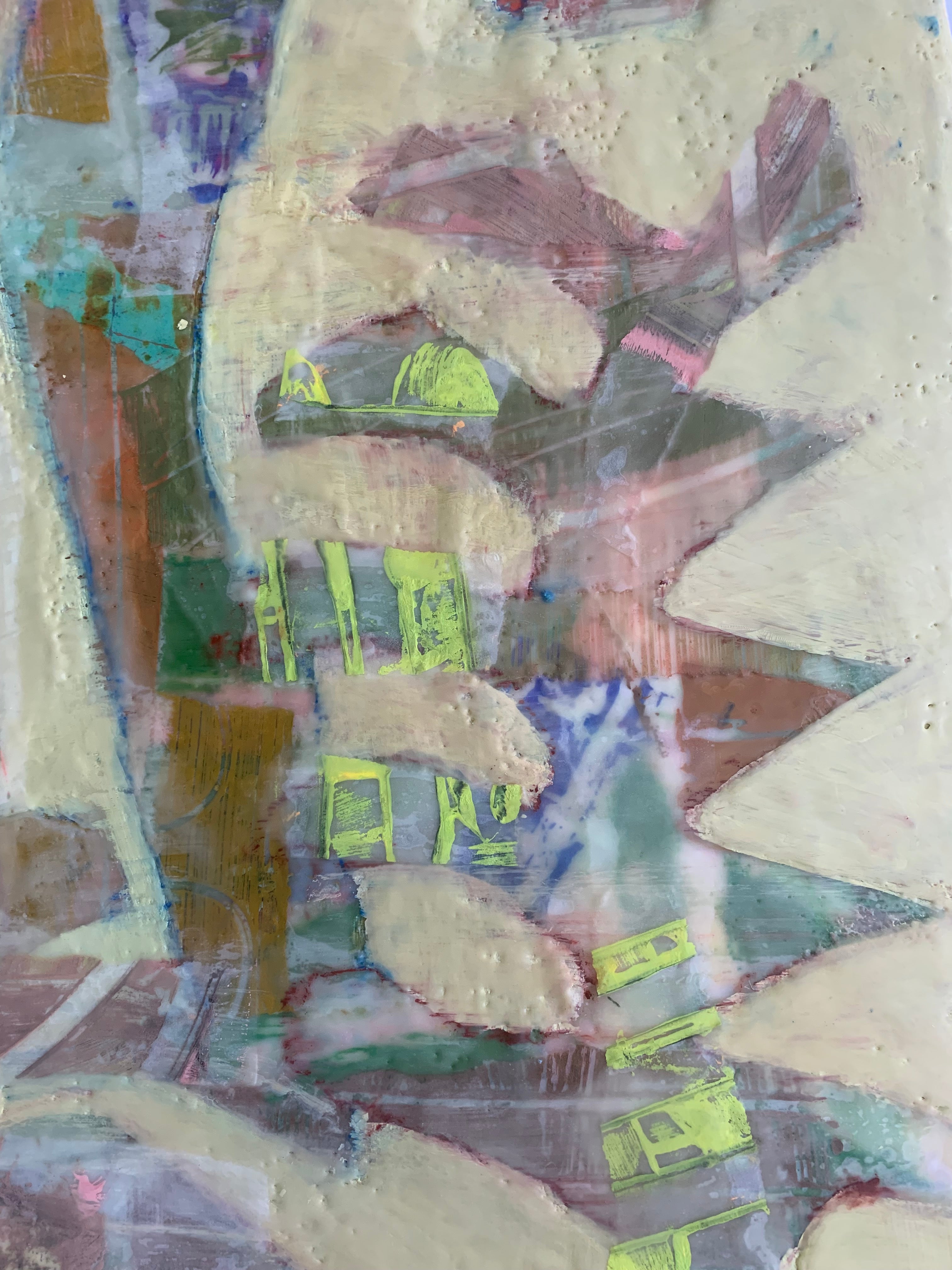 Margaret Meredith is an abstract painter working in acrylic and mixed media. Her work explores emotional atmosphere through layered surfaces, intuitive mark‑making, and a palette that balances moody, muted tones with moments of vivid color. Her recent work builds on botanical themes first explored in 2023, suggesting organic growth and memory rather than literal representation. Alongside this, Meredith has created minimalist, encaustic-medium, and collage‑based works that continue to inform her layered approach. Currently, she is focused on acrylic painting, embracing its fluidity and the freedom to work with water. Pencil marks, printed elements, stencils, and hand‑made tools play an ongoing role in her process, reflecting her love of printmaking and experimental mark‑making. Margaret Meredith lives and works in Columbus, Georgia, with her husband, a woodworker and mushroom farmer, and their two sons.