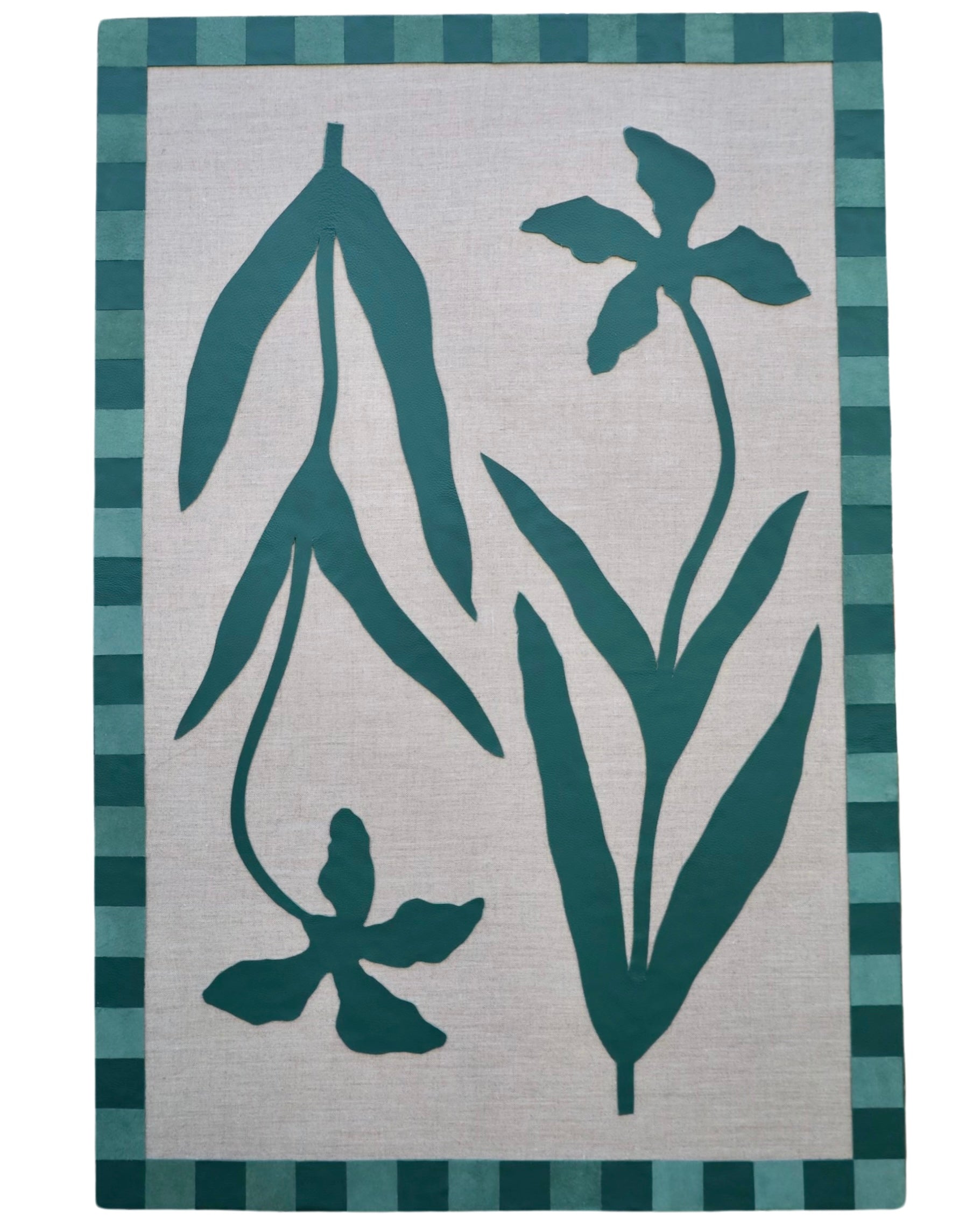 My passion as an artist comes from a life-long desire to create. Growing up with a parent in the military, I was consistently moving around from one place to the next, all the while collecting shapes, places and colors to put in my back pocket and one day use. I was always a painter but started to expand my idea of what could and couldn't be used as art in high school and continued until I finally found my material of choice while in college doing a project made of scrap textiles, including leather and other recycled materials. Years later, in 2018, I started my embarkment as an artist experimenting with different mediums and textiles that slowly evolved into my primary use of leather today. Currently, I live in Memphis, Tennessee with my husband, Alan, and our child, Arrison. When I'm not in the studio, we are often found enjoying local parks, taking nature walks led by our little one. Inspired by the landscapes I grew up seeing and my travels, I soak in my surroundings and then illustrate them in my own way through collages. I am always mesmerized with the way the calming colors and soft layered textures of my pieces can speak to others without using words. A little leather on a wooden panel creates a shared experience between you, the viewer, and me, the artist. This connection brings me such joy and compels me to create the way I see the world: full of color and unsuspecting textures.