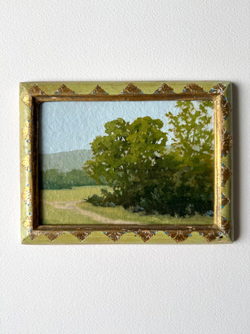 Jennifer was born in Jackson MS and moved to Nashville as a child. She enjoyed art as a child and painted with oils a bit as a teen, but ultimately went to MTSU to earn a degree in nutrition. Jennifer didn’t truly begin painting again until her children were in school full time, and started simply by painting pieces she wanted to hang in her own home. Discovering a love for vintage and antique frames (not to mention looking for these frames both in-person and online), she began pairing them with her favorite paintings. She paints primarily in acrylics on handmade paper. “I love the juxtaposition of a vintage/antique frame with the freshness of a modern landscape on textured handmade paper; the marriage of that tradition and history combined with the fresh clean colors in my pieces brings me joy.” She finds inspiration in clouds and trees and the hunt for the perfect vintage frame. Jennifer lives in Nashville with her husband and two boys.
