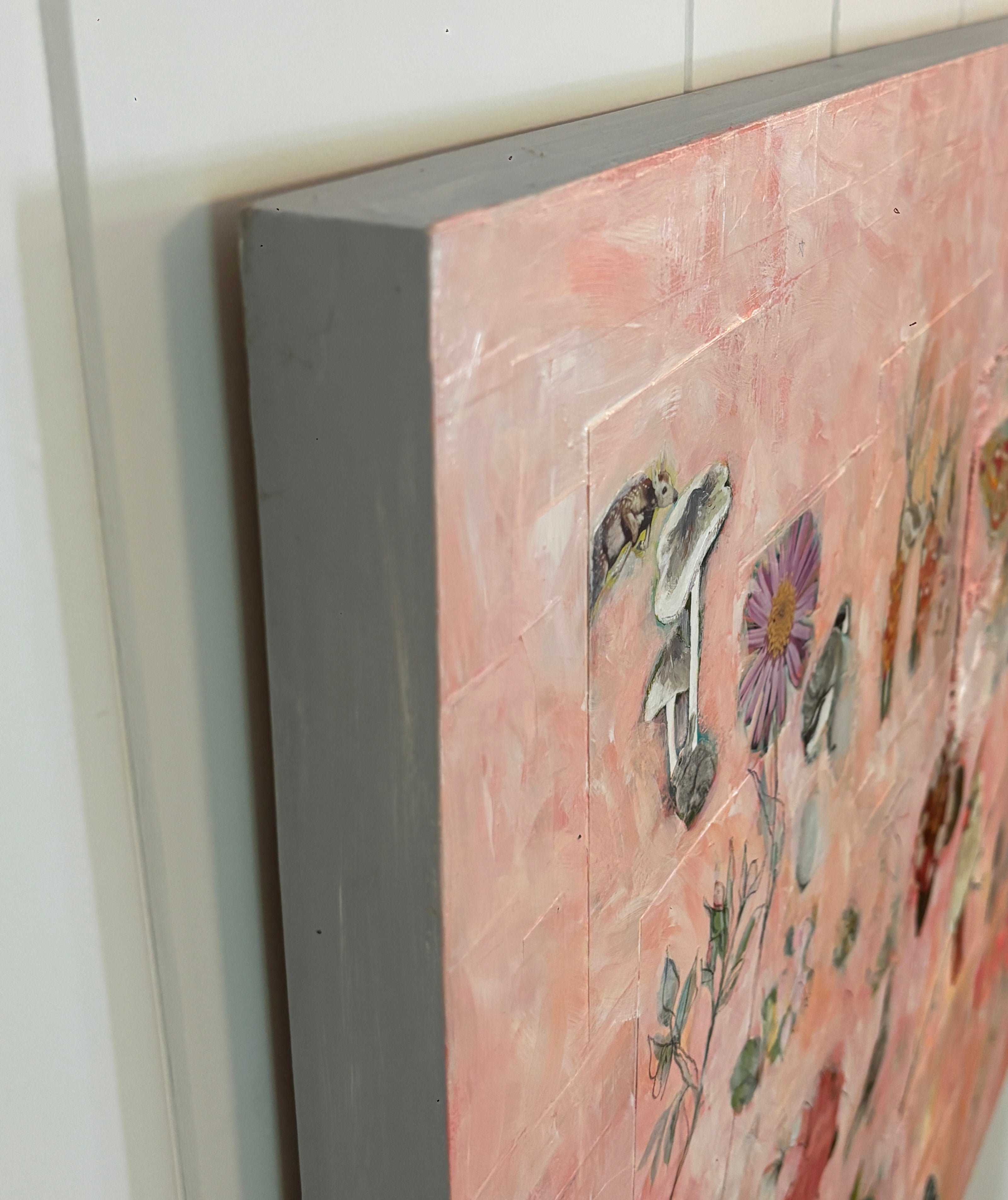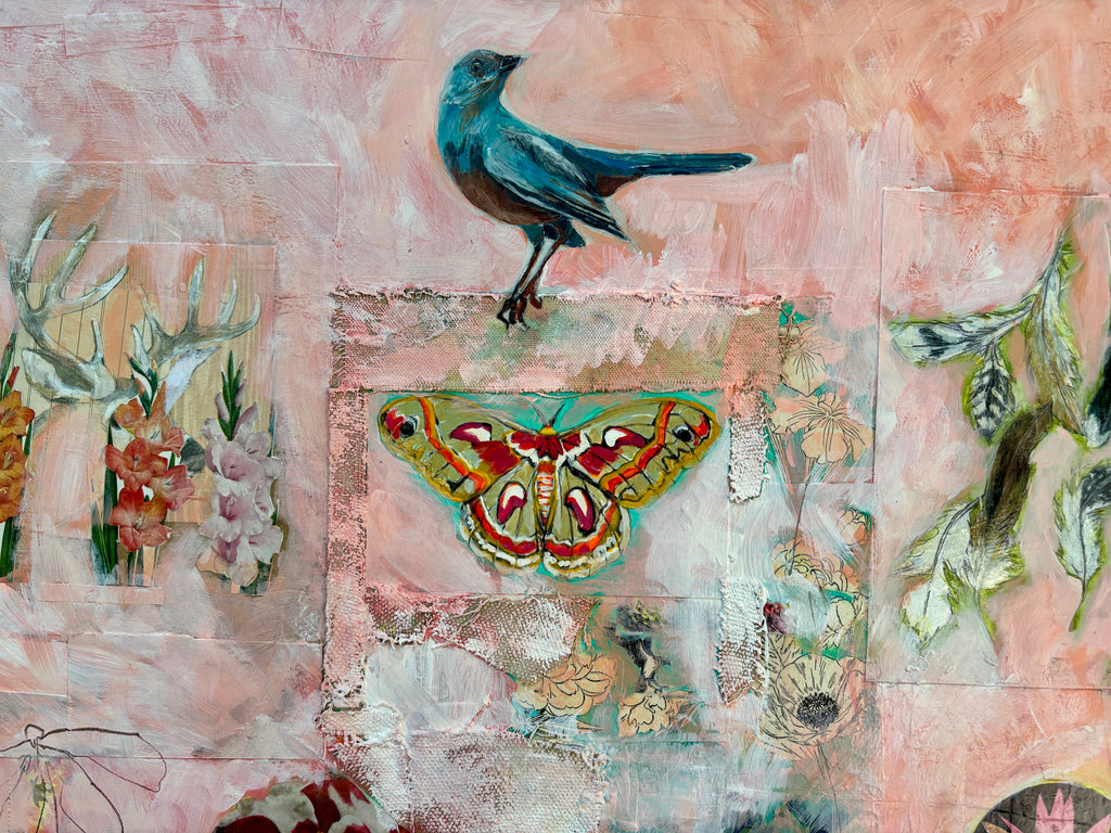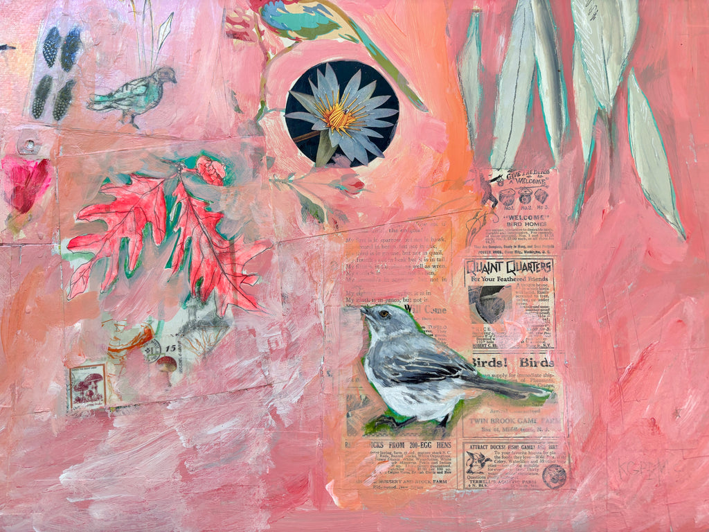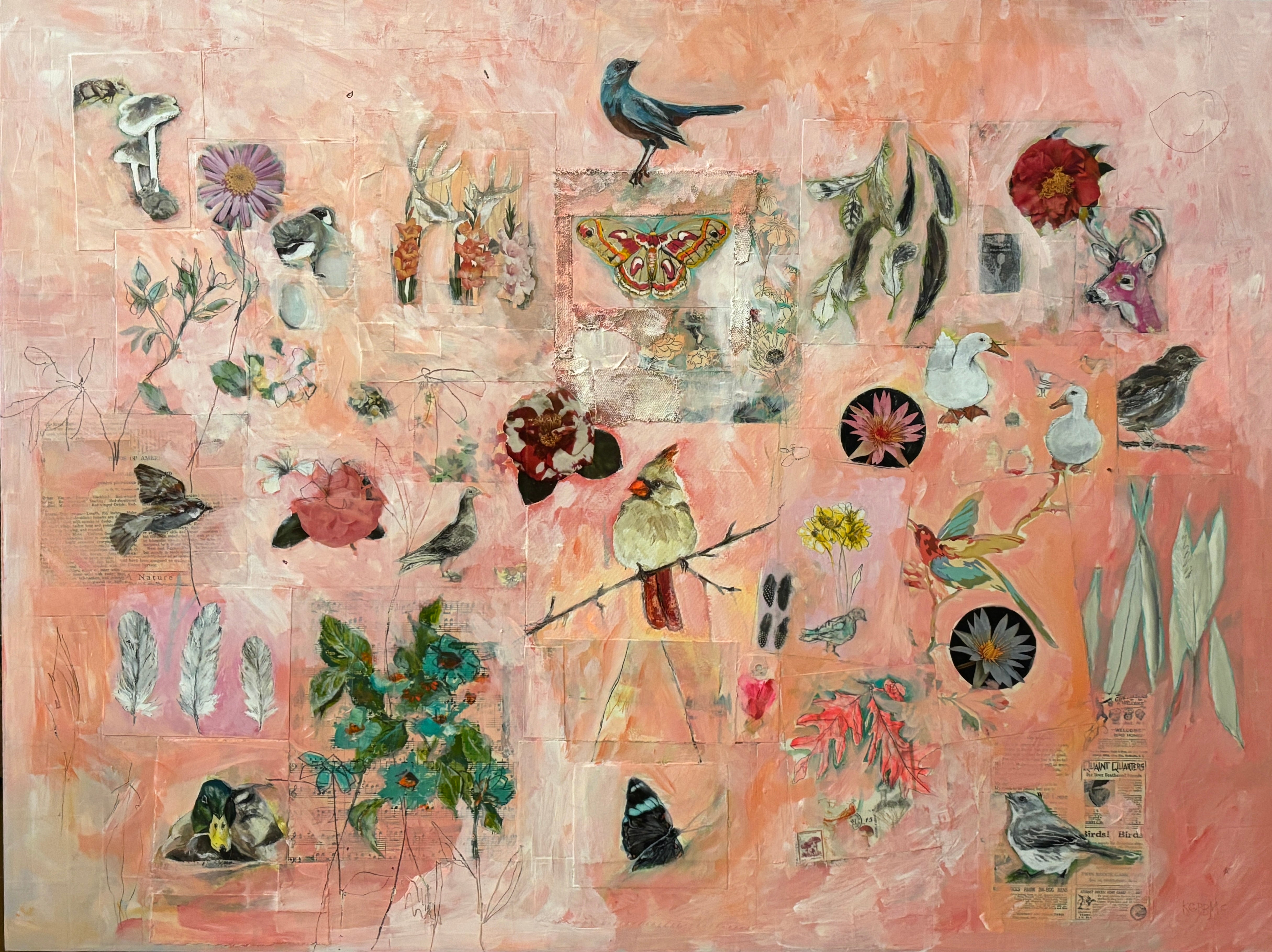 A lifelong artist, I make art because coming up with an idea is what gets me out of bed in the morning and into my studio, mercifully located in my home. So much of what I love in life is at home- my pets inside and wildlife out, nature pouring through the windows, comfortably cluttered rooms full of books and art, the forest surrounding me. My art originates with that early morning idea, a daily walk in the woods, the imagery around me. The deep connection to my surroundings is reflected in the art I make, even using pages of books in my art and the book itself as the canvas with the animals love as the subject. Animal and landscape renderings in mixed media, storytelling dioramas and large works on canvas all have a similar feel of natural wonder.