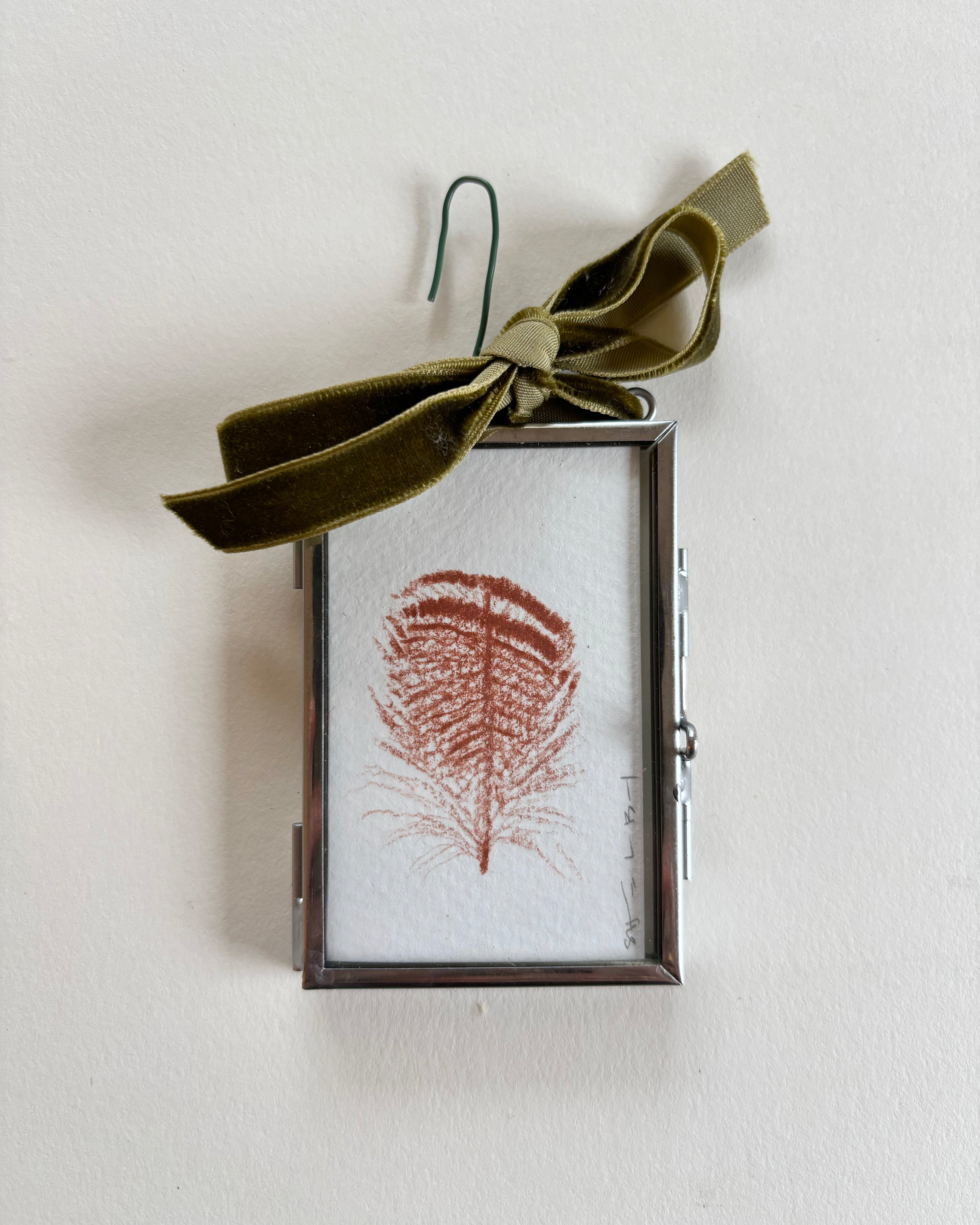 mixed media on paper, in gold frame ornament with chain and velvet ribbon