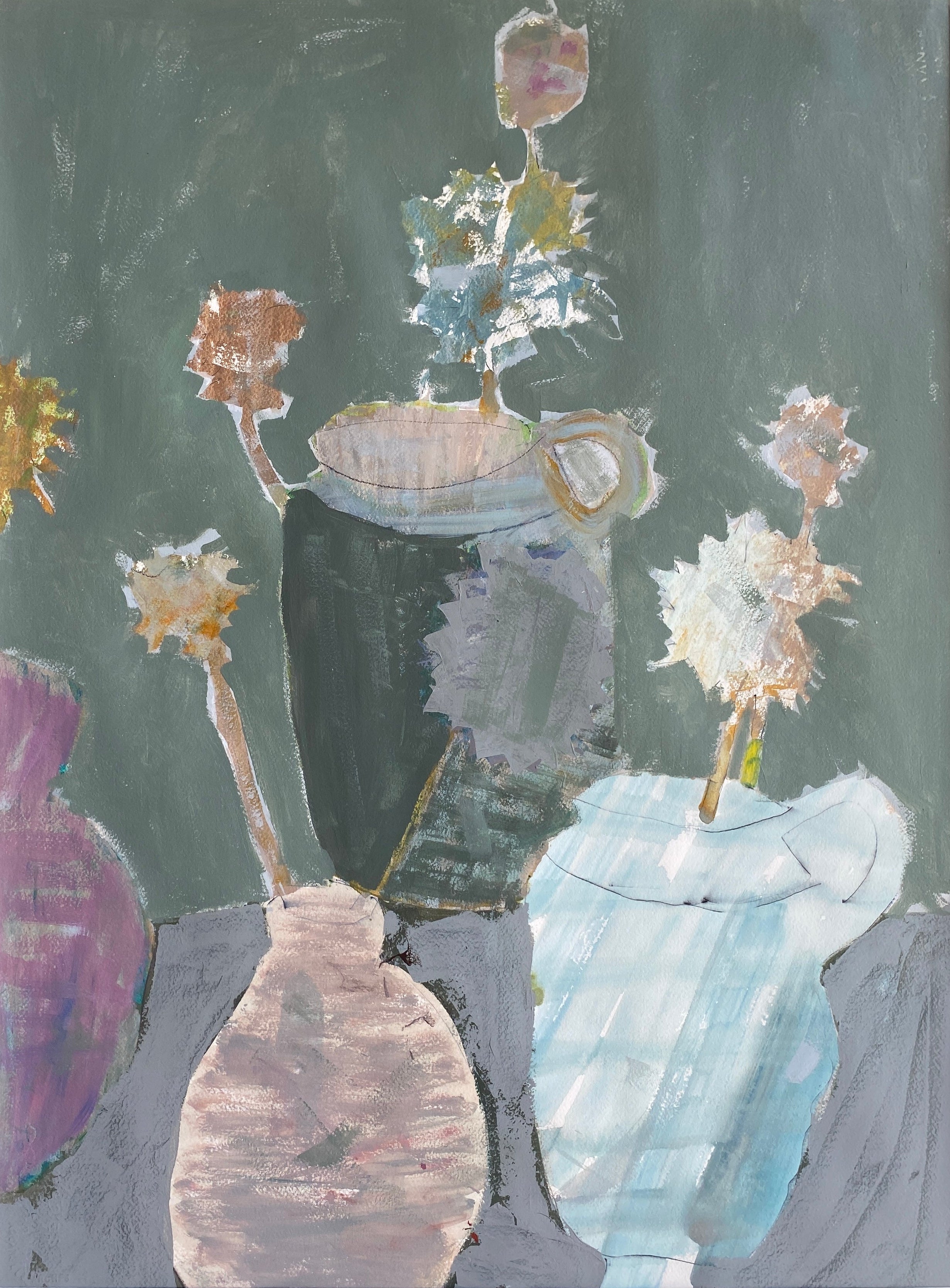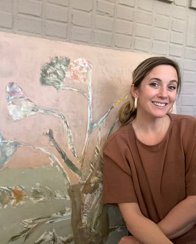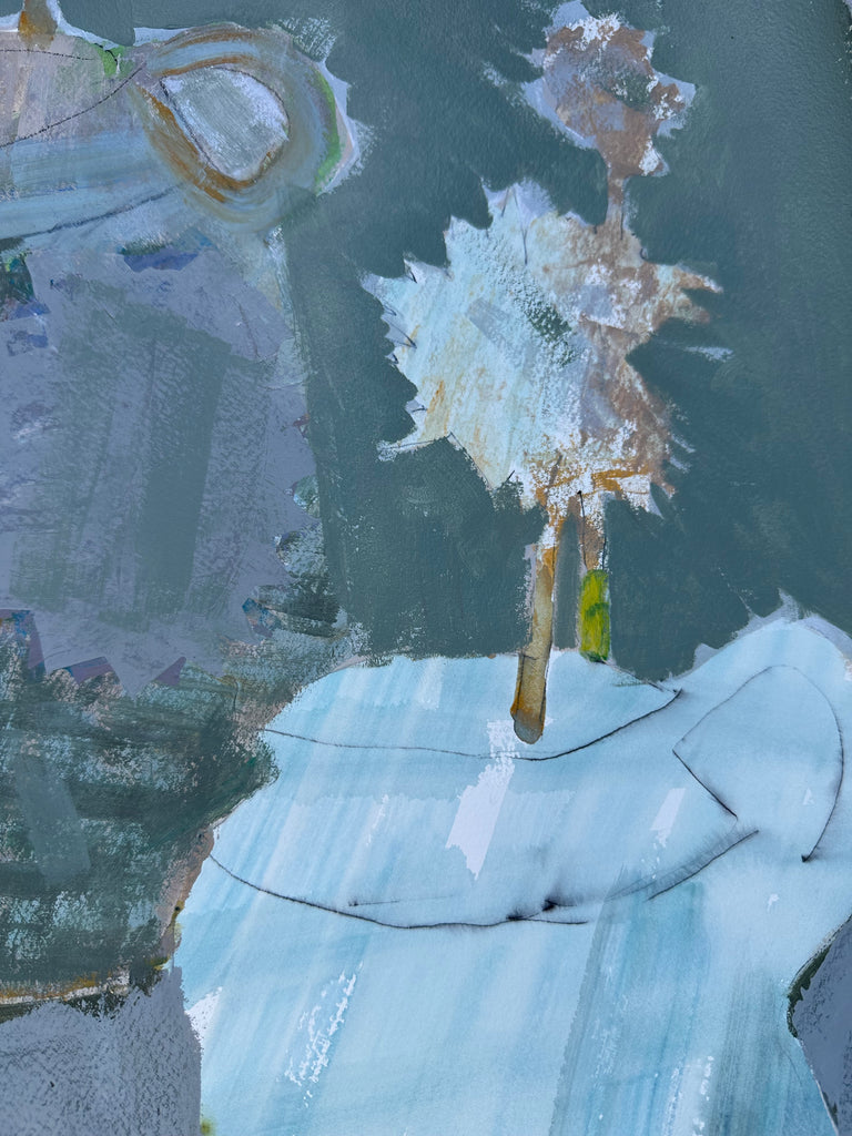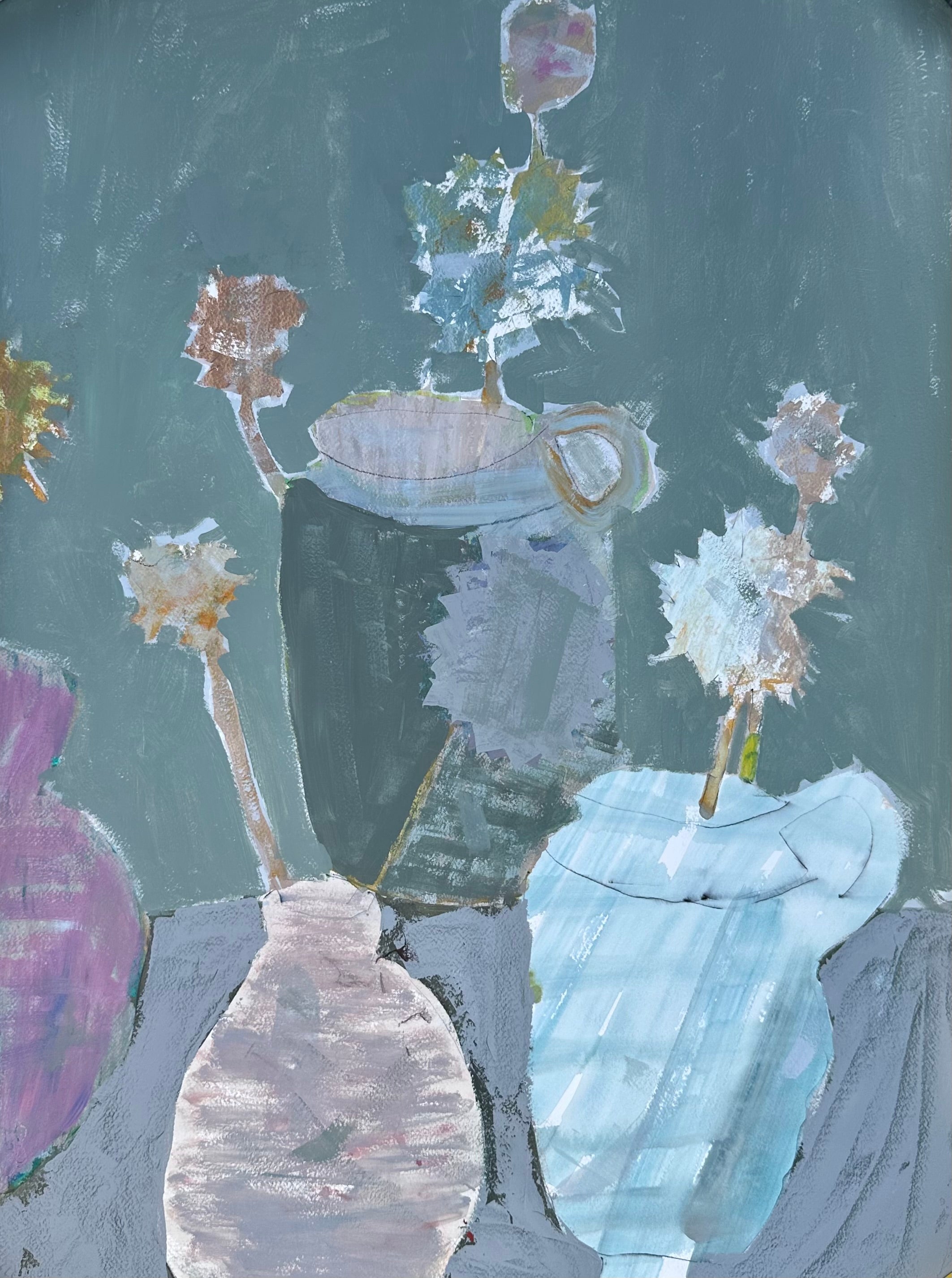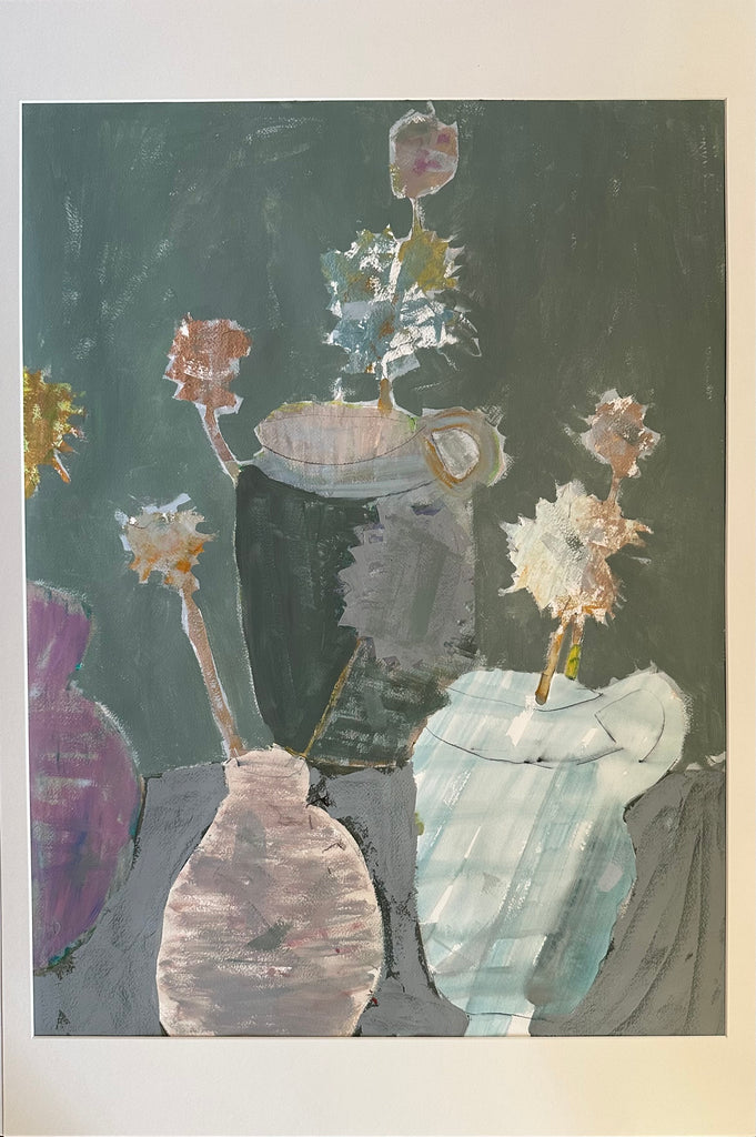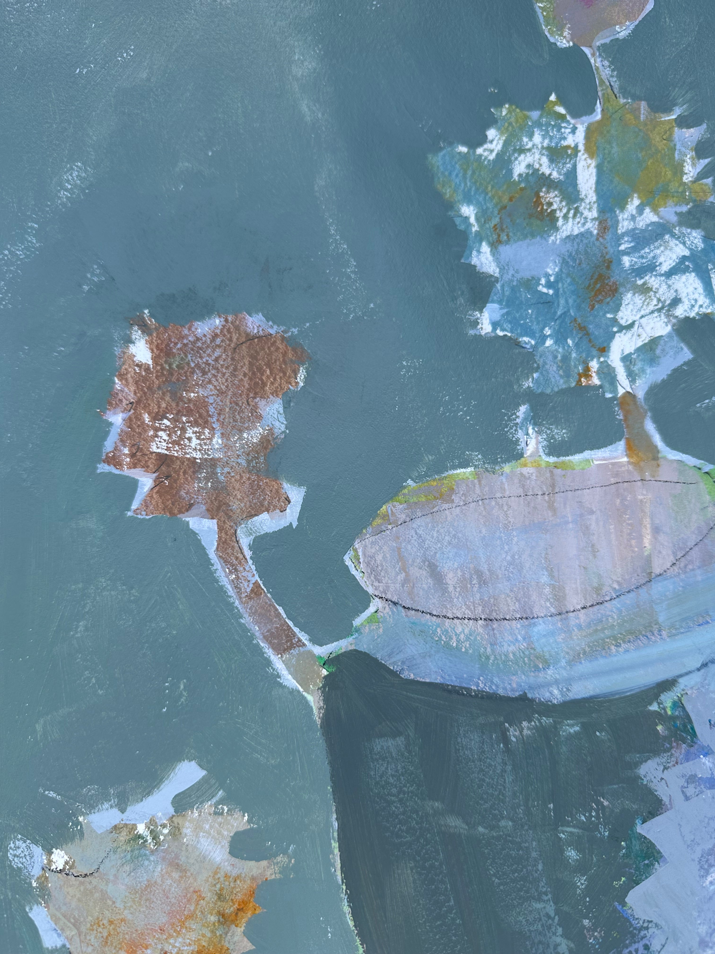 Margaret Meredith is an abstract painter working in acrylic and mixed media. Her work explores emotional atmosphere through layered surfaces, intuitive mark‑making, and a palette that balances moody, muted tones with moments of vivid color. Her recent work builds on botanical themes first explored in 2023, suggesting organic growth and memory rather than literal representation. Alongside this, Meredith has created minimalist, encaustic-medium, and collage‑based works that continue to inform her layered approach. Currently, she is focused on acrylic painting, embracing its fluidity and the freedom to work with water. Pencil marks, printed elements, stencils, and hand‑made tools play an ongoing role in her process, reflecting her love of printmaking and experimental mark‑making. Margaret Meredith lives and works in Columbus, Georgia, with her husband, a woodworker and mushroom farmer, and their two sons.