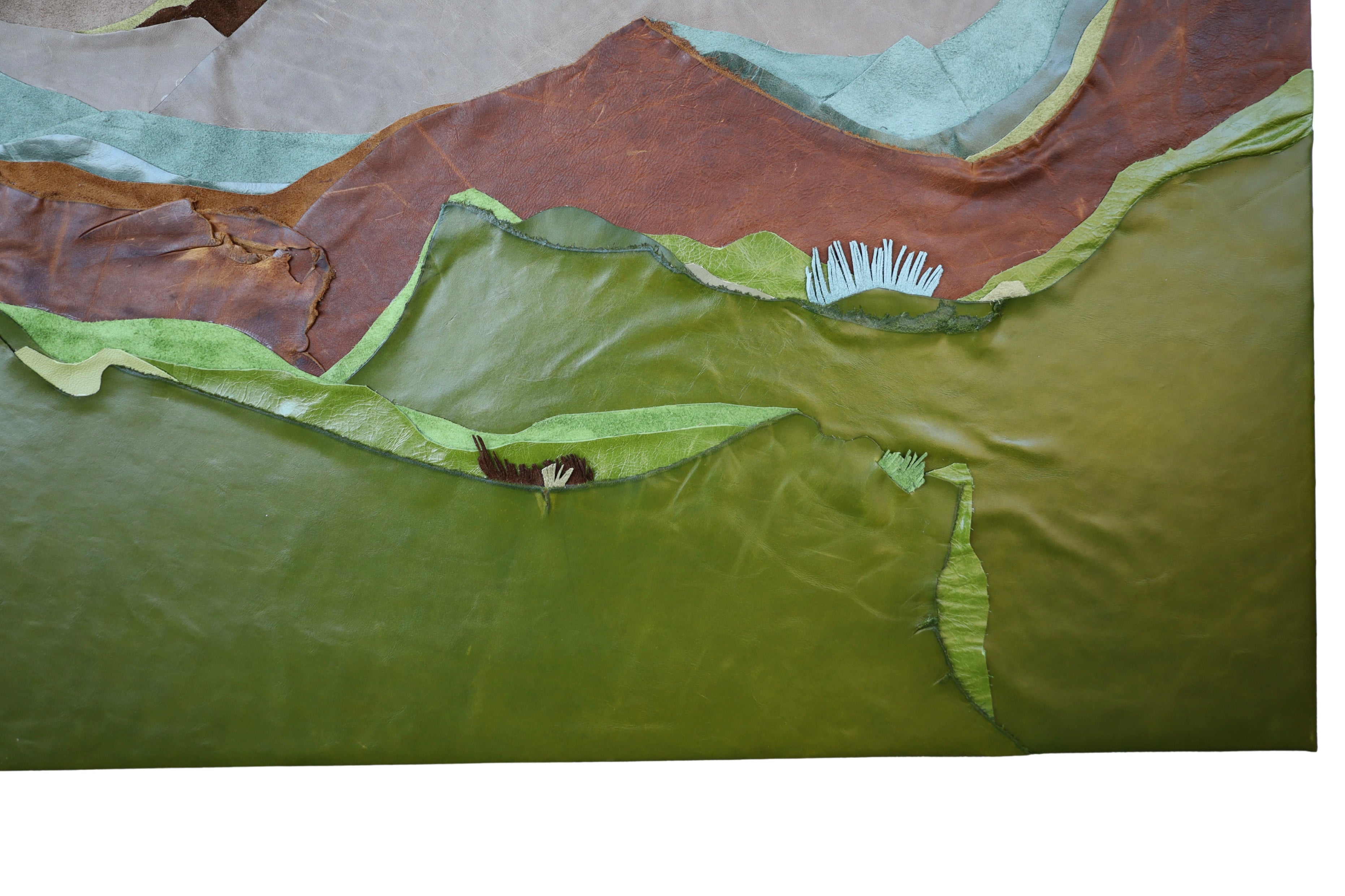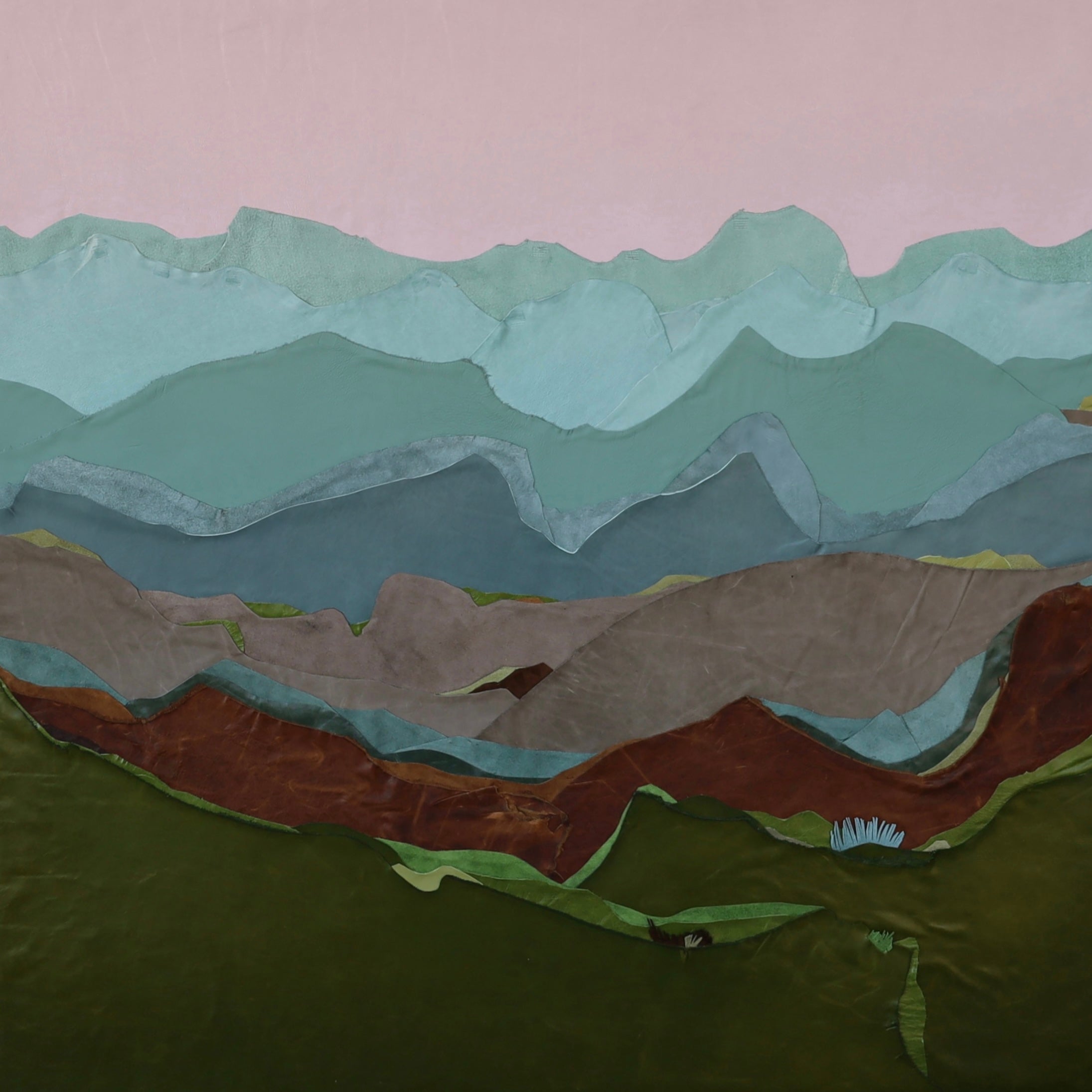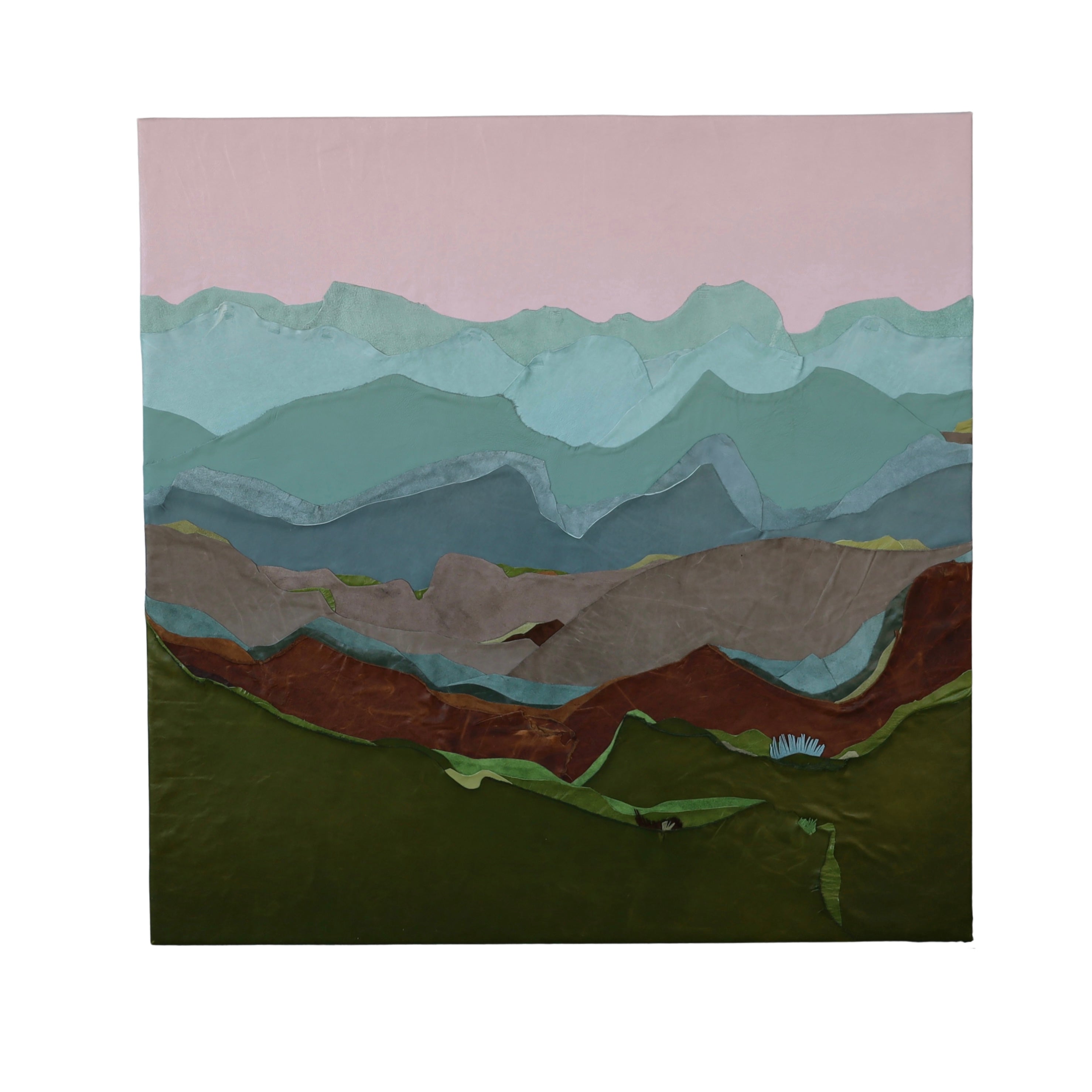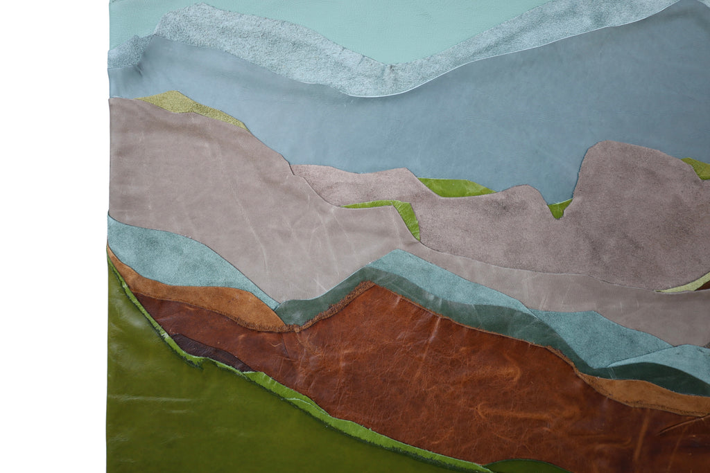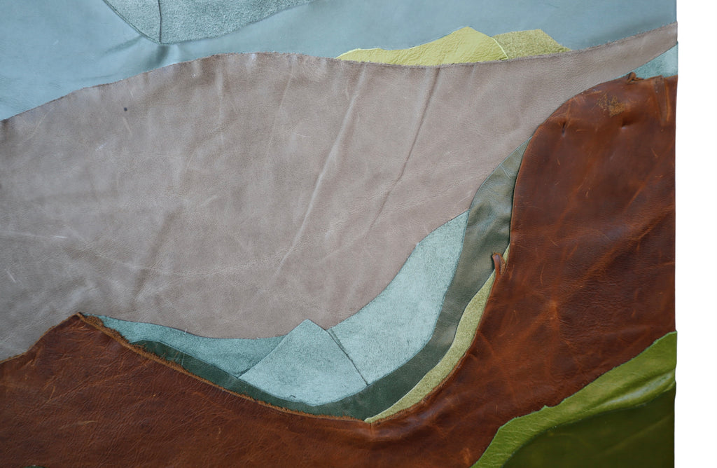 My passion as an artist comes from a life-long desire to create. Growing up with a parent in the military, I was consistently moving around from one place to the next, all the while collecting shapes, places and colors to put in my back pocket and one day use. I was always a painter but started to expand my idea of what could and couldn't be used as art in high school and continued until I finally found my material of choice while in college doing a project made of scrap textiles, including leather and other recycled materials. Years later, in 2018, I started my embarkment as an artist experimenting with different mediums and textiles that slowly evolved into my primary use of leather today. Currently, I live in Memphis, Tennessee with my husband, Alan, and our child, Arrison. When I'm not in the studio, we are often found enjoying local parks, taking nature walks led by our little one. Inspired by the landscapes I grew up seeing and my travels, I soak in my surroundings and then illustrate them in my own way through collages. I am always mesmerized with the way the calming colors and soft layered textures of my pieces can speak to others without using words. A little leather on a wooden panel creates a shared experience between you, the viewer, and me, the artist. This connection brings me such joy and compels me to create the way I see the world: full of color and unsuspecting textures.