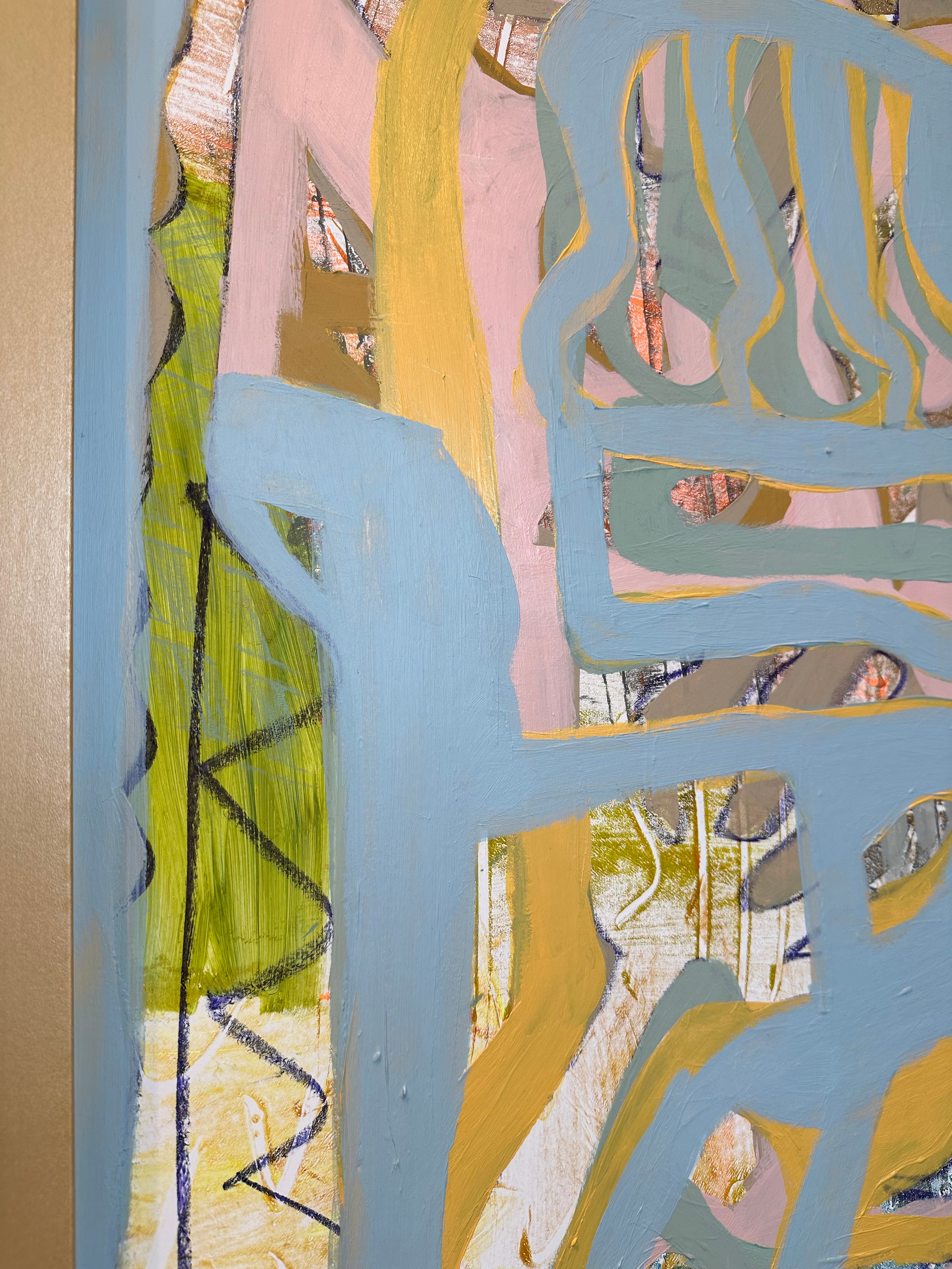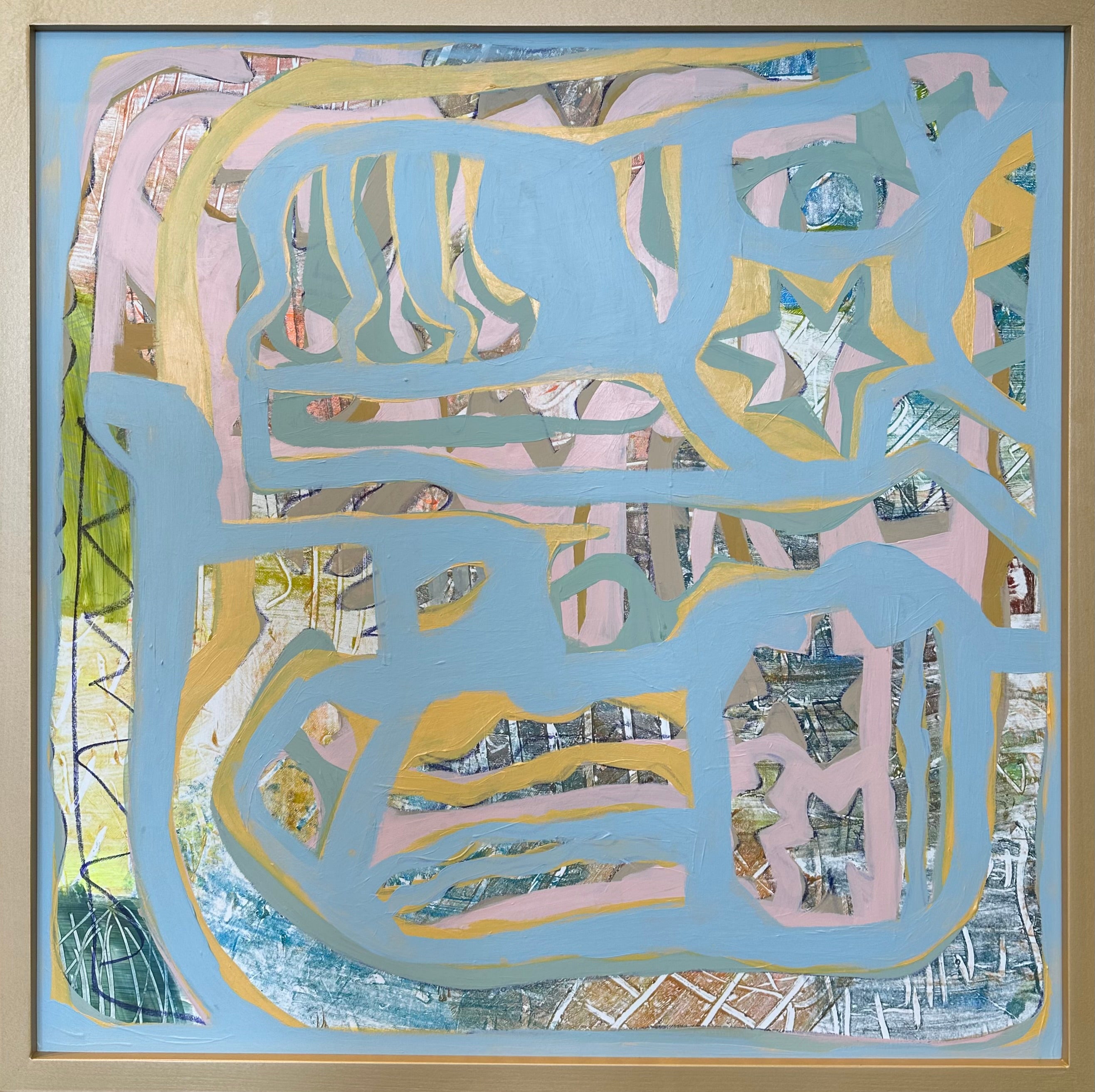 Margaret Meredith is an abstract painter working in acrylic and mixed media. Her work explores emotional atmosphere through layered surfaces, intuitive mark‑making, and a palette that balances moody, muted tones with moments of vivid color. Her recent work builds on botanical themes first explored in 2023, suggesting organic growth and memory rather than literal representation. Alongside this, Meredith has created minimalist, encaustic-medium, and collage‑based works that continue to inform her layered approach. Currently, she is focused on acrylic painting, embracing its fluidity and the freedom to work with water. Pencil marks, printed elements, stencils, and hand‑made tools play an ongoing role in her process, reflecting her love of printmaking and experimental mark‑making. Margaret Meredith lives and works in Columbus, Georgia, with her husband, a woodworker and mushroom farmer, and their two sons.