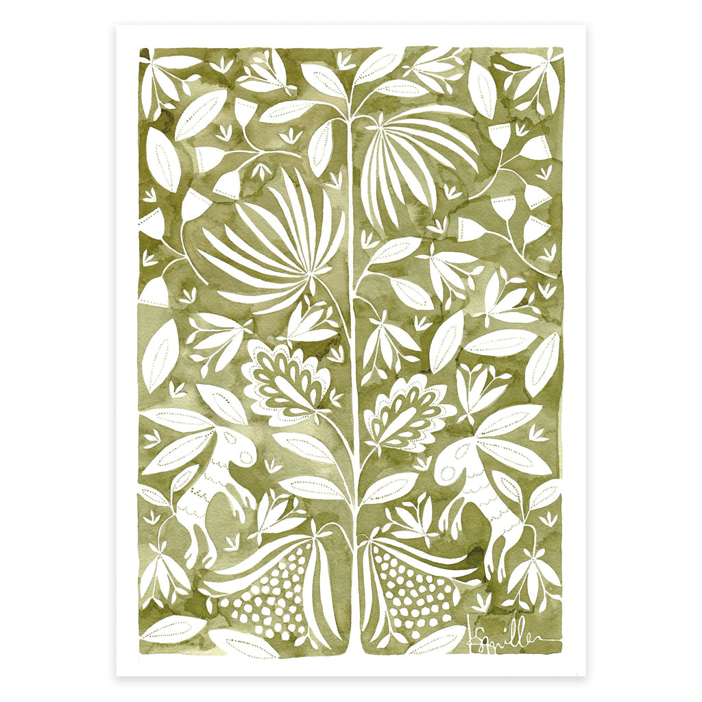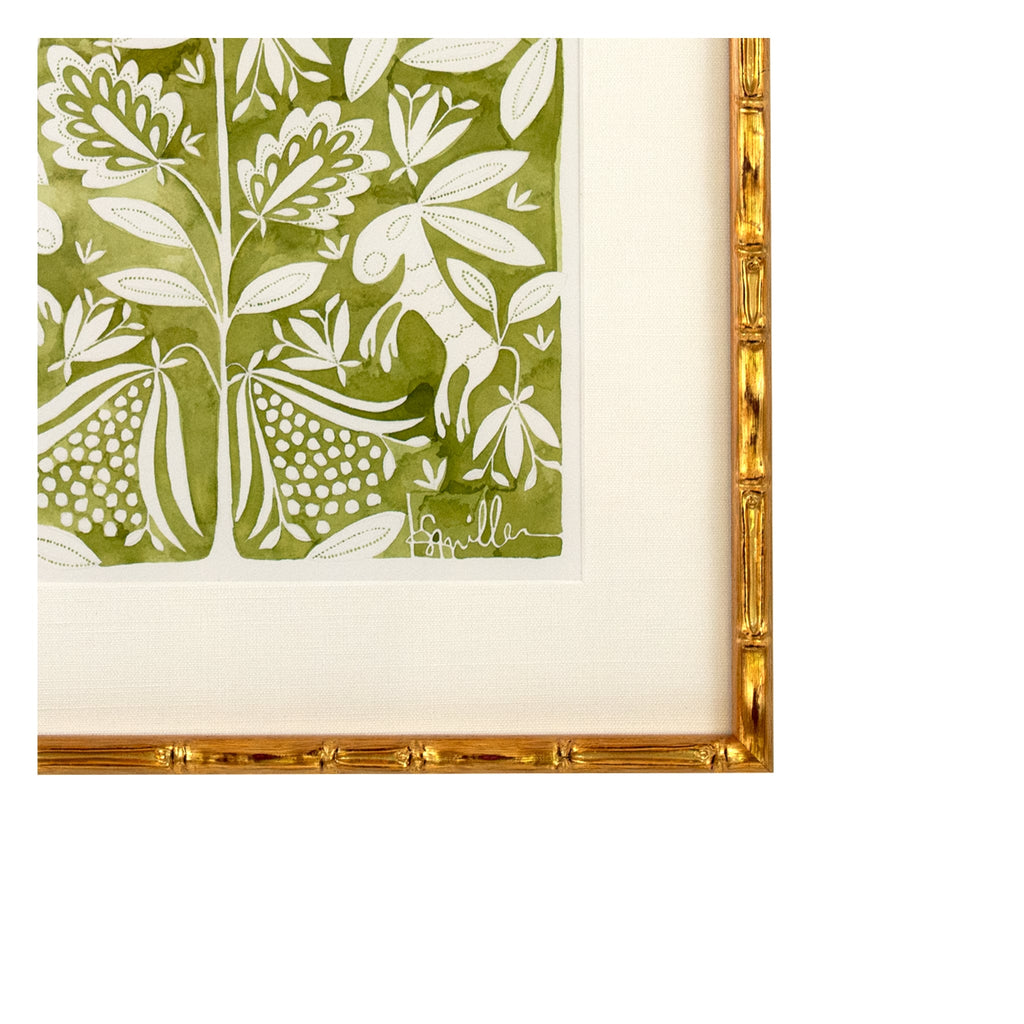 watercolor and gouache floating on white linen mat, framed in gold bamboo frame