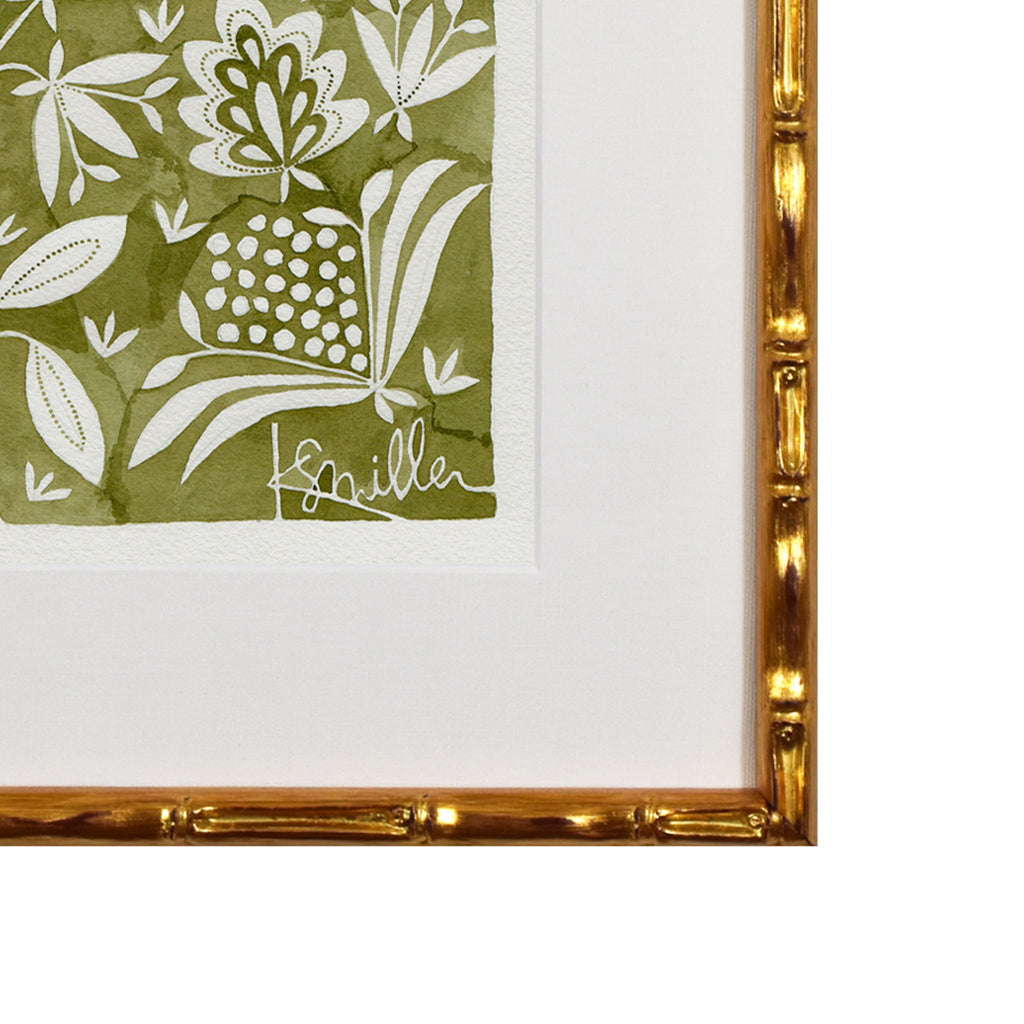 watercolor and gouache on paper, floating on linen mat, framed in gold bamboo frame