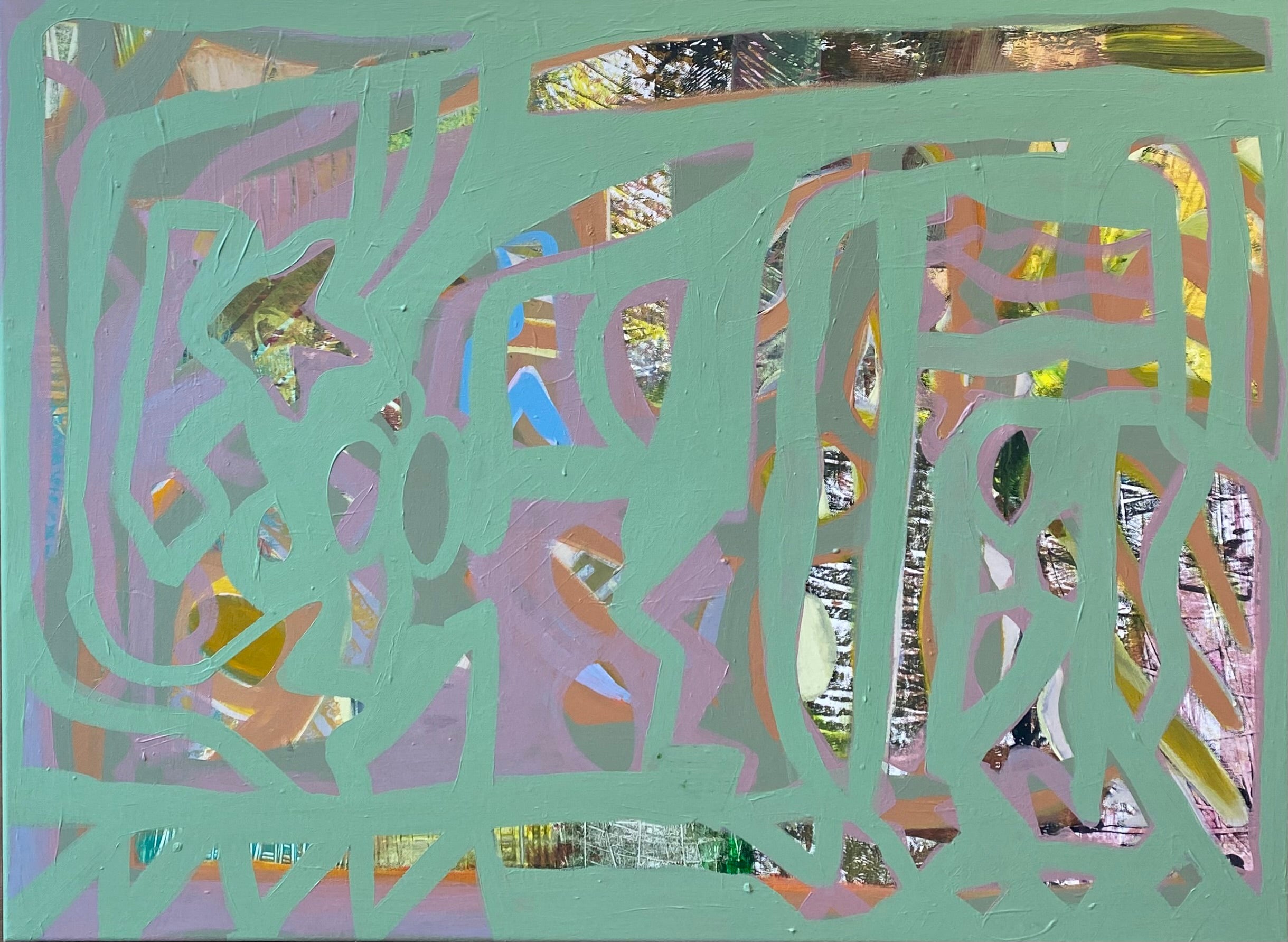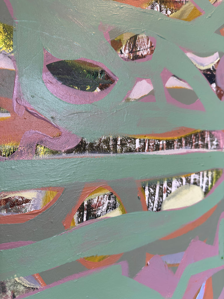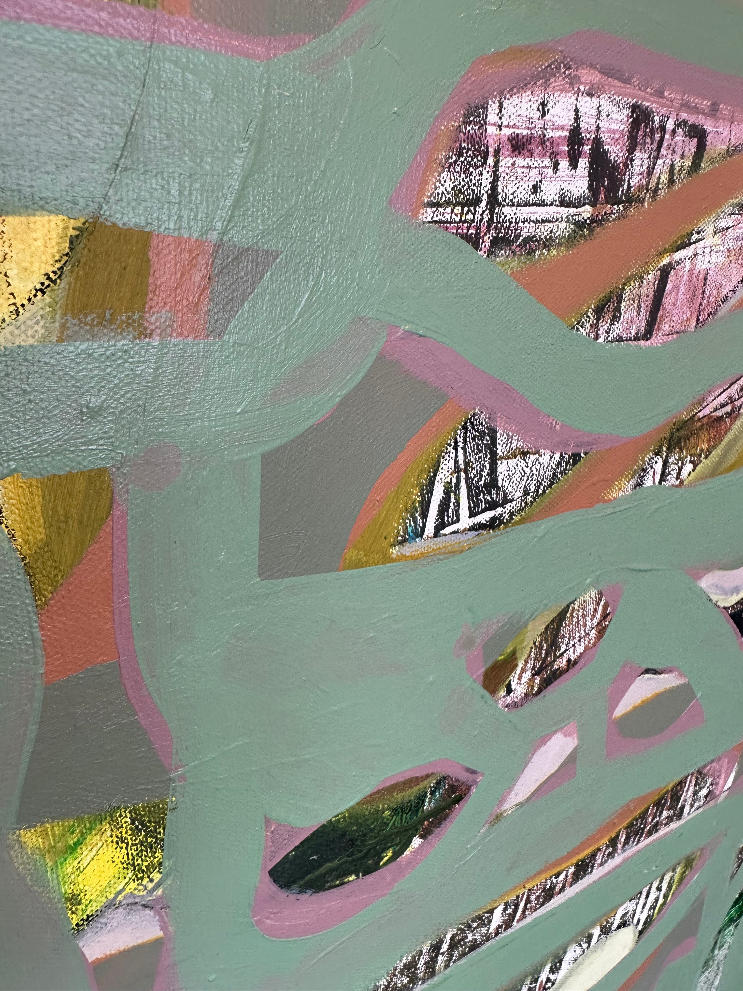 Margaret Meredith is an abstract painter working in acrylic and mixed media. Her work explores emotional atmosphere through layered surfaces, intuitive mark‑making, and a palette that balances moody, muted tones with moments of vivid color. Her recent work builds on botanical themes first explored in 2023, suggesting organic growth and memory rather than literal representation. Alongside this, Meredith has created minimalist, encaustic-medium, and collage‑based works that continue to inform her layered approach. Currently, she is focused on acrylic painting, embracing its fluidity and the freedom to work with water. Pencil marks, printed elements, stencils, and hand‑made tools play an ongoing role in her process, reflecting her love of printmaking and experimental mark‑making. Margaret Meredith lives and works in Columbus, Georgia, with her husband, a woodworker and mushroom farmer, and their two sons.