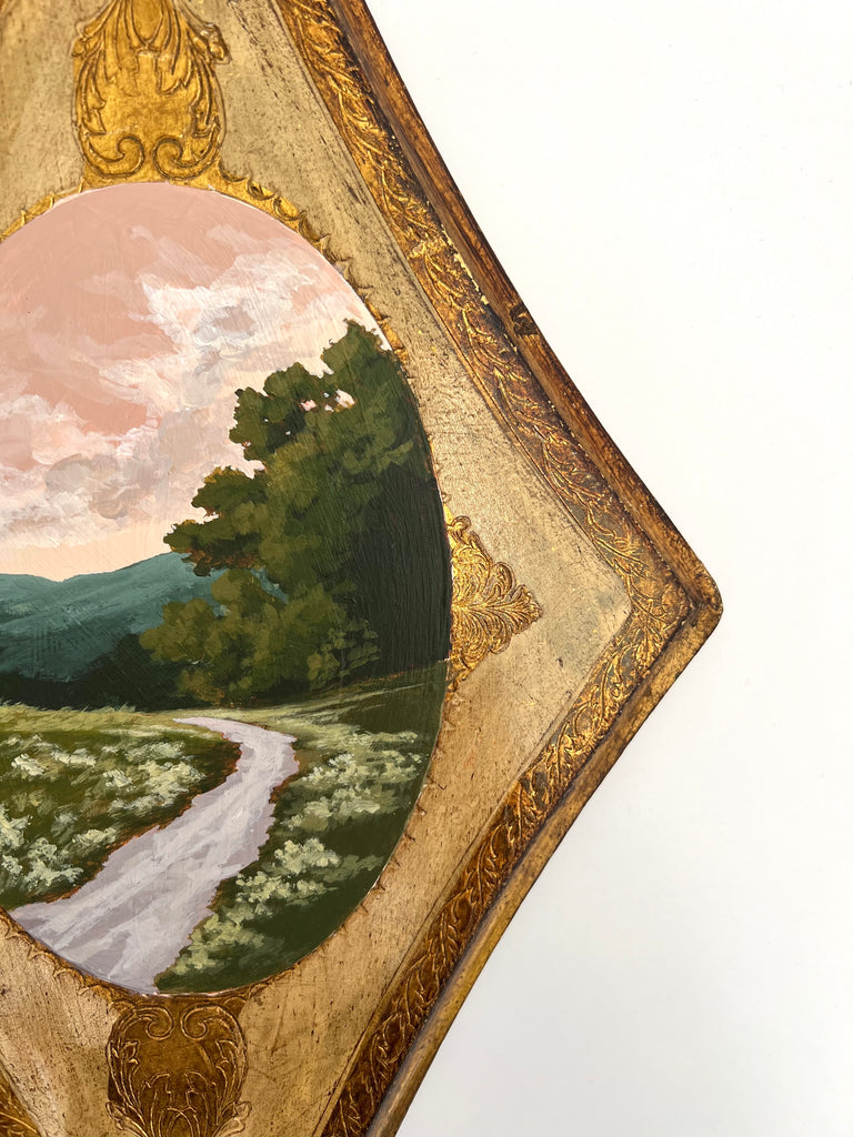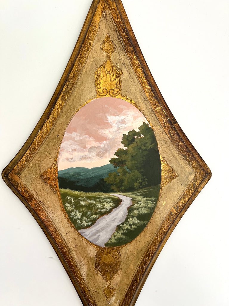 Jennifer was born in Jackson MS and moved to Nashville as a child. She enjoyed art as a child and painted with oils a bit as a teen, but ultimately went to MTSU to earn a degree in nutrition. Jennifer didn’t truly begin painting again until her children were in school full time, and started simply by painting pieces she wanted to hang in her own home. Discovering a love for vintage and antique frames (not to mention looking for these frames both in-person and online), she began pairing them with her favorite paintings. She paints primarily in acrylics on handmade paper. “I love the juxtaposition of a vintage/antique frame with the freshness of a modern landscape on textured handmade paper; the marriage of that tradition and history combined with the fresh clean colors in my pieces brings me joy.” She finds inspiration in clouds and trees and the hunt for the perfect vintage frame. Jennifer lives in Nashville with her husband and two boys.