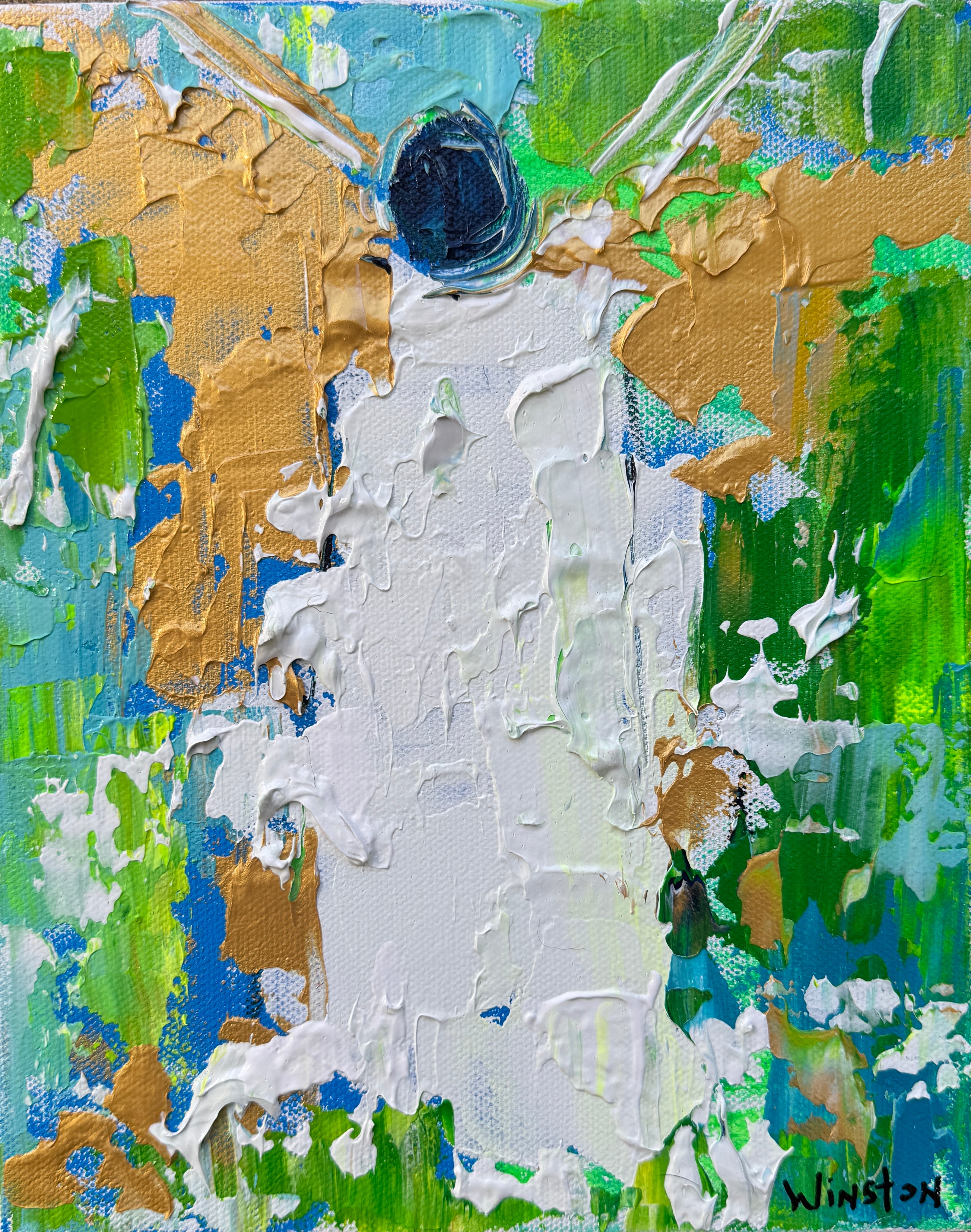 Winston Wiant is originally from Amelia Island, Florida, and full of southern charm. She brings her whimsical and witty delight to each and every painting. Having painted since childhood, she received a Bachelor of Arts degree in Studio Art at Brenau University and has been pursuing her love of art ever since. Her paintings are full of texture, using the palette knife and free brushstrokes to layer the paint, creating one energetic piece after another. She lives in Athens, GA, with her husband and two daughters and paints in her home studio. “Art to me is a form of self-expression. The way I feel that day reflects in my work. My love of bold color and texture is both distinctive and captivating.”