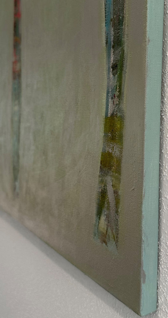 Margaret Meredith is an abstract painter working in acrylic and mixed media. Her work explores emotional atmosphere through layered surfaces, intuitive mark‑making, and a palette that balances moody, muted tones with moments of vivid color. Her recent work builds on botanical themes first explored in 2023, suggesting organic growth and memory rather than literal representation. Alongside this, Meredith has created minimalist, encaustic-medium, and collage‑based works that continue to inform her layered approach. Currently, she is focused on acrylic painting, embracing its fluidity and the freedom to work with water. Pencil marks, printed elements, stencils, and hand‑made tools play an ongoing role in her process, reflecting her love of printmaking and experimental mark‑making. Margaret Meredith lives and works in Columbus, Georgia, with her husband, a woodworker and mushroom farmer, and their two sons.