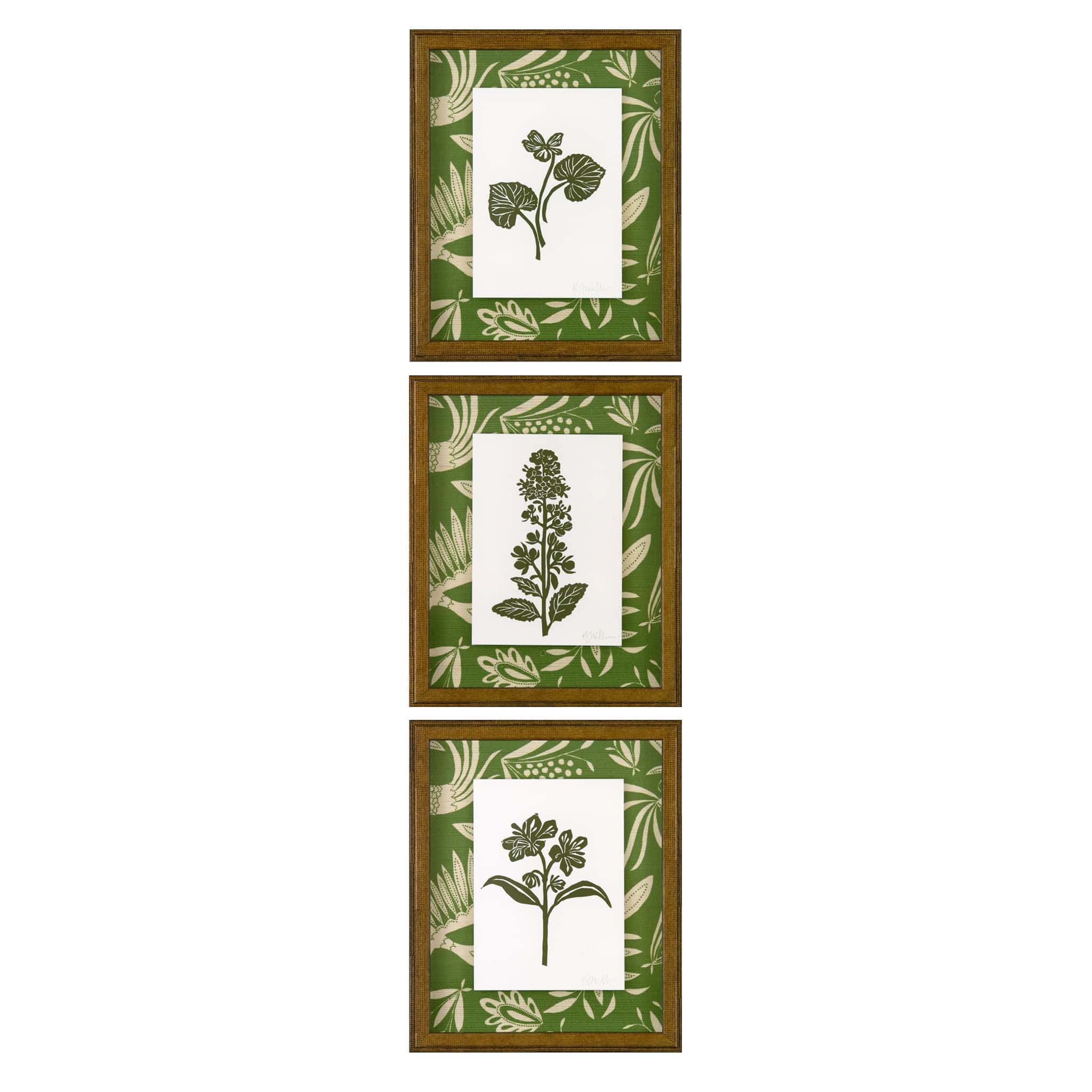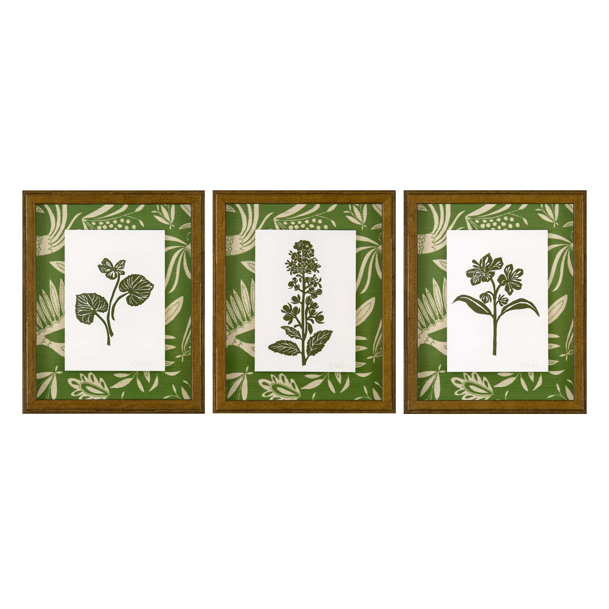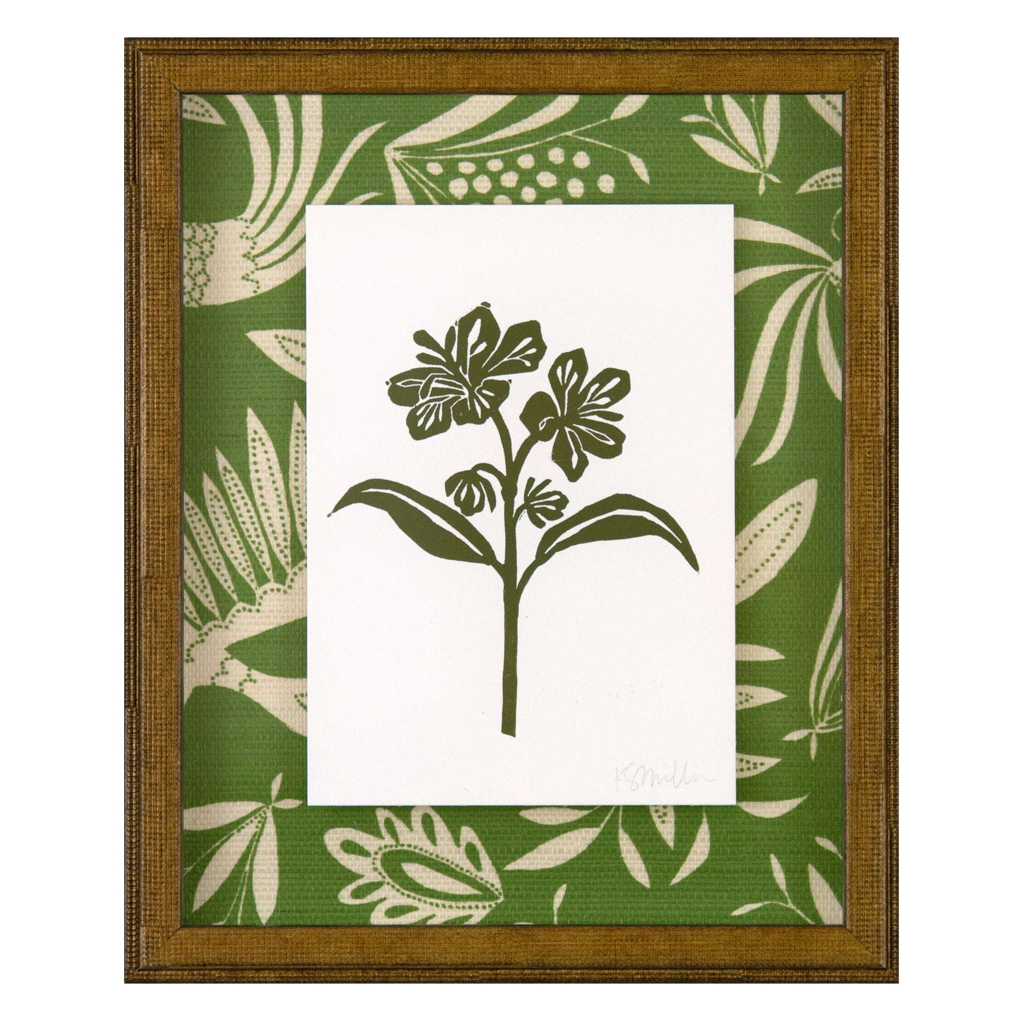 linocut floating on Katherine Stratton Miller wallpaper, framed in gold frame