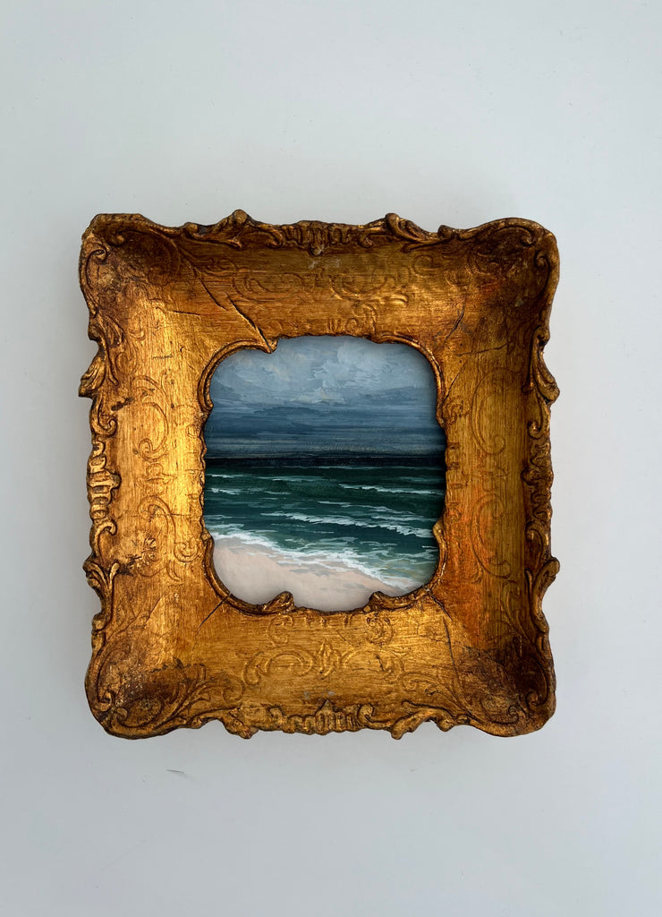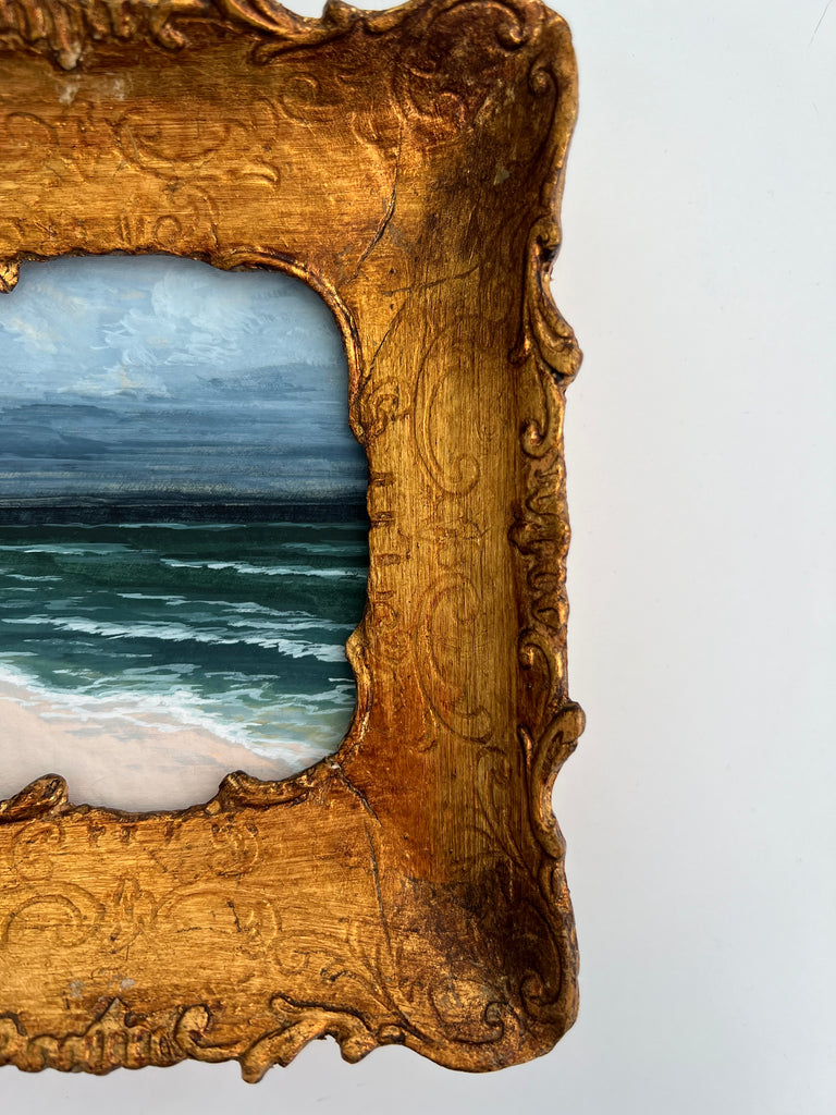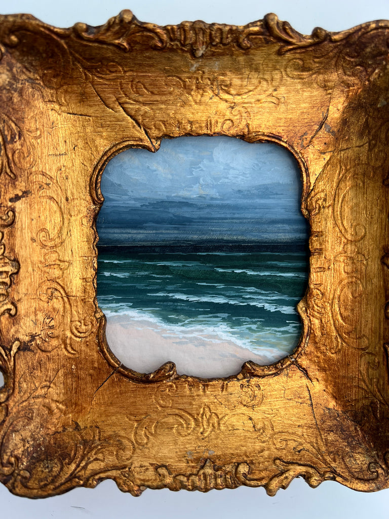 gouache, watercolor and wax on handmade paper, in gold frame