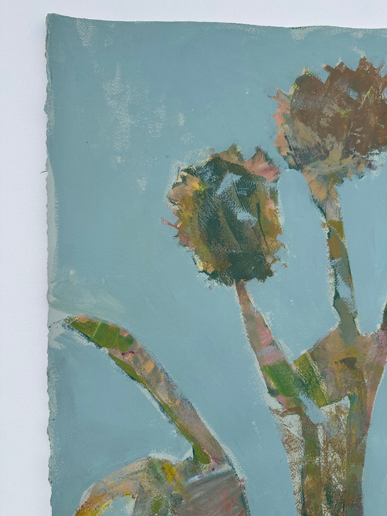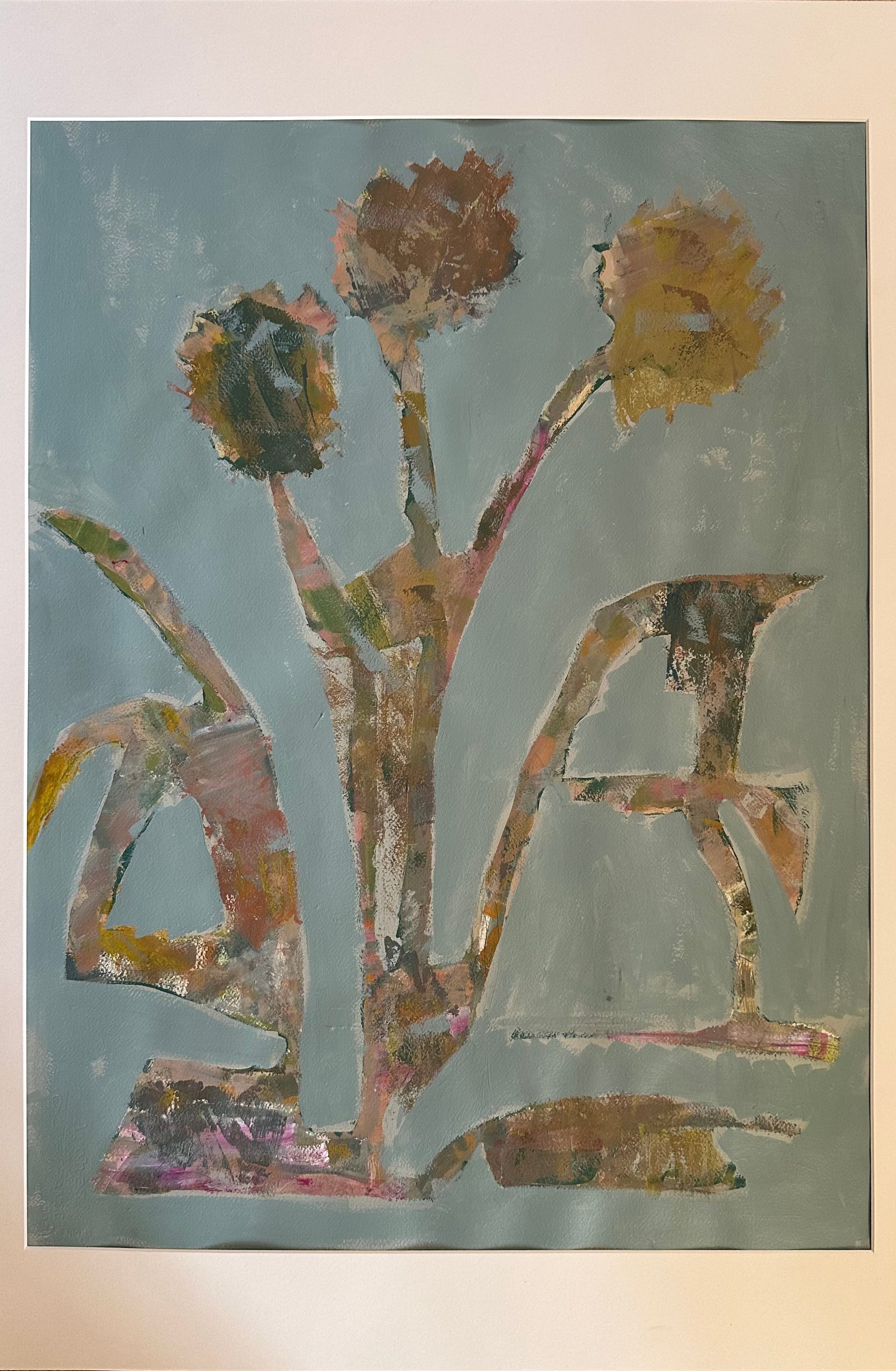 Margaret Meredith is an abstract painter working in acrylic and mixed media. Her work explores emotional atmosphere through layered surfaces, intuitive mark‑making, and a palette that balances moody, muted tones with moments of vivid color. Her recent work builds on botanical themes first explored in 2023, suggesting organic growth and memory rather than literal representation. Alongside this, Meredith has created minimalist, encaustic-medium, and collage‑based works that continue to inform her layered approach. Currently, she is focused on acrylic painting, embracing its fluidity and the freedom to work with water. Pencil marks, printed elements, stencils, and hand‑made tools play an ongoing role in her process, reflecting her love of printmaking and experimental mark‑making. Margaret Meredith lives and works in Columbus, Georgia, with her husband, a woodworker and mushroom farmer, and their two sons.