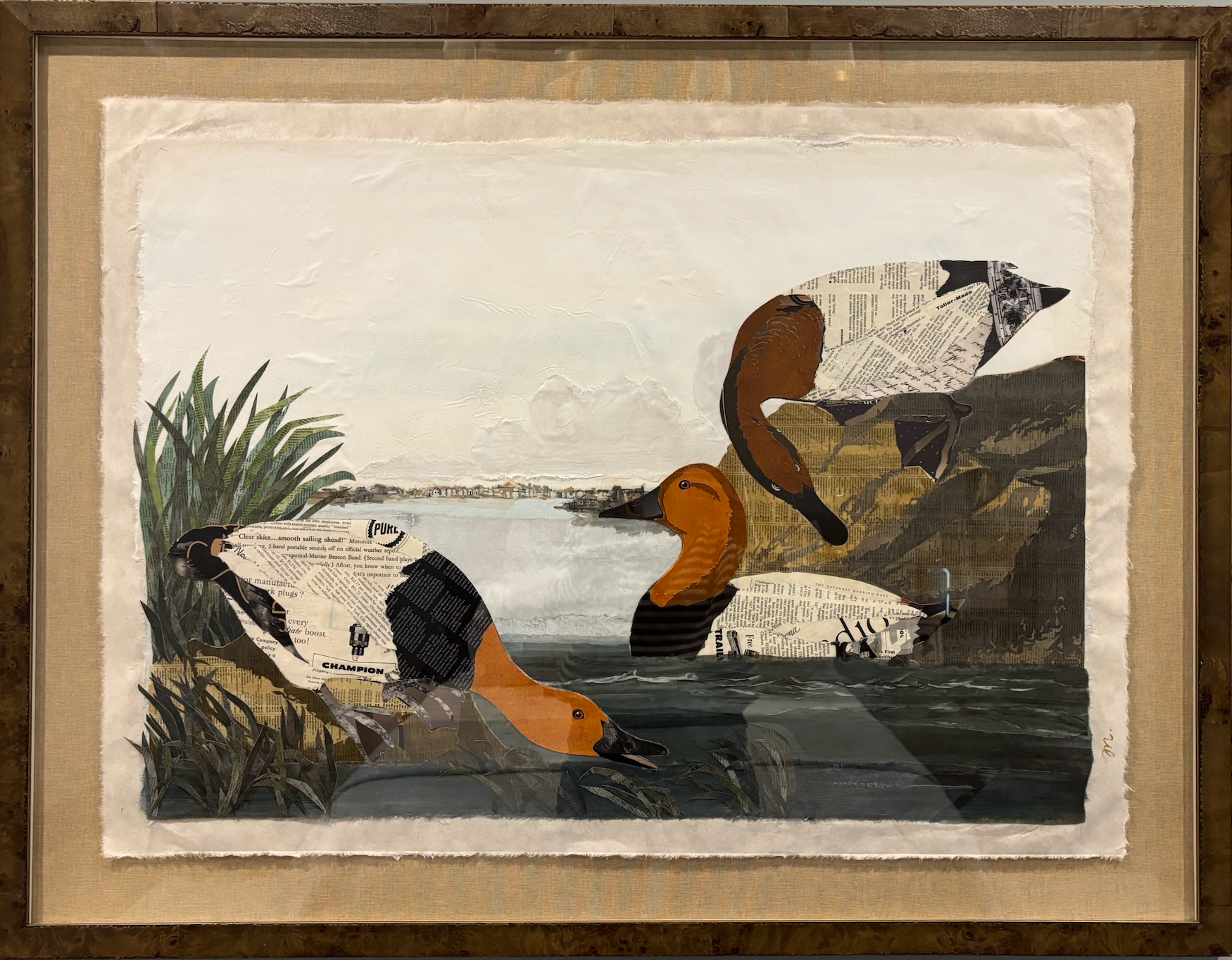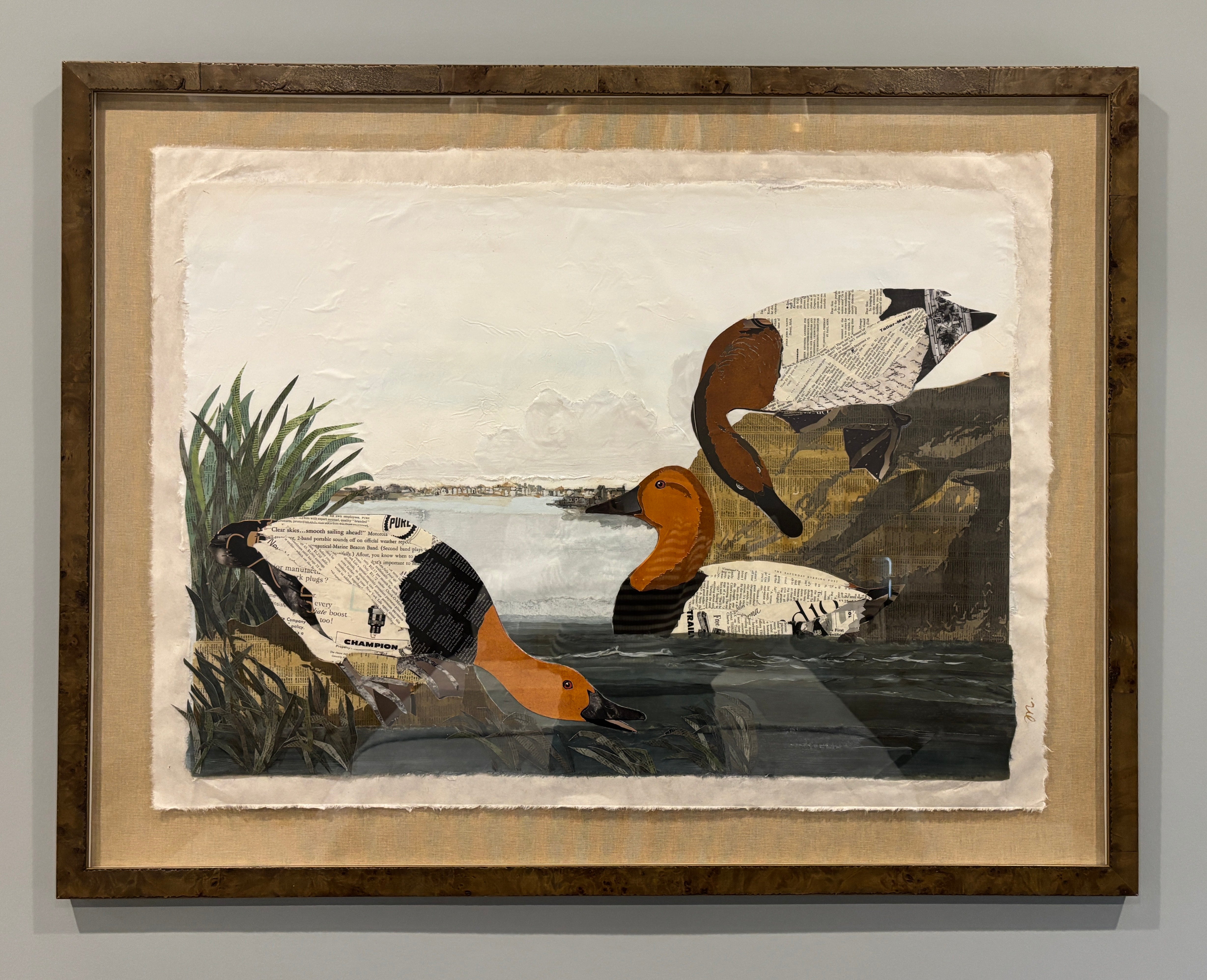 mixed media collage, floated on brown linen mat and framed in brown wooden frame