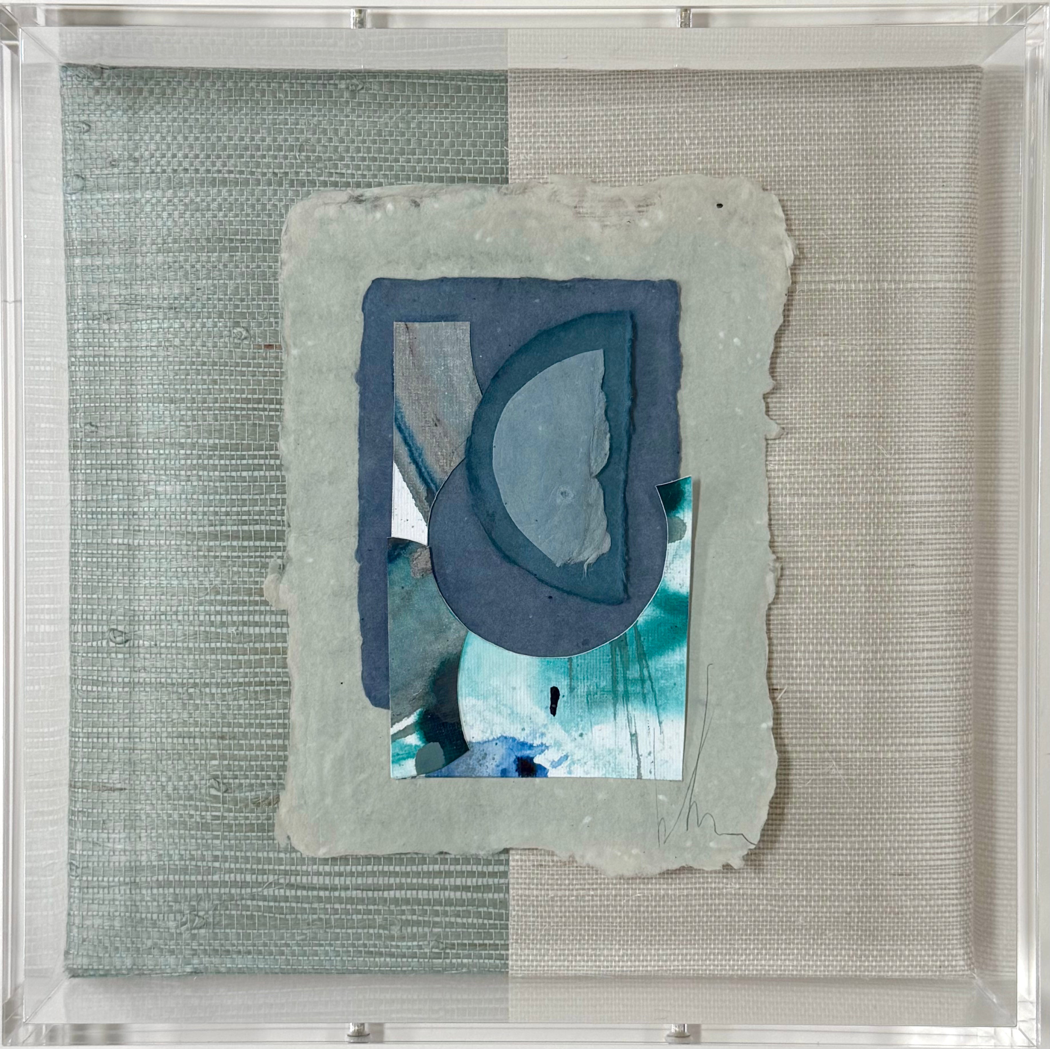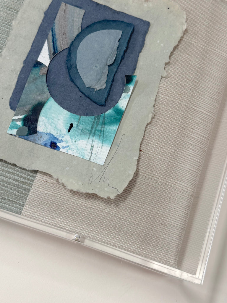 mixed media collage with handmade paper and acrylic, floating fabric backing in acrylic frame