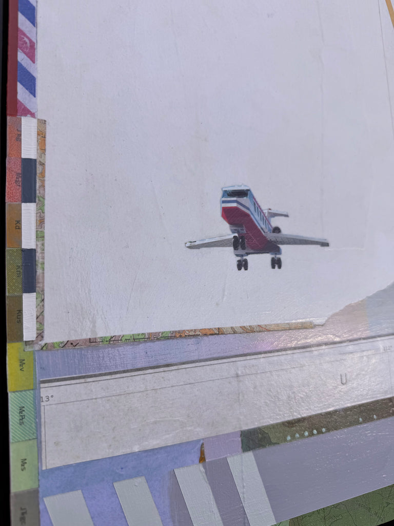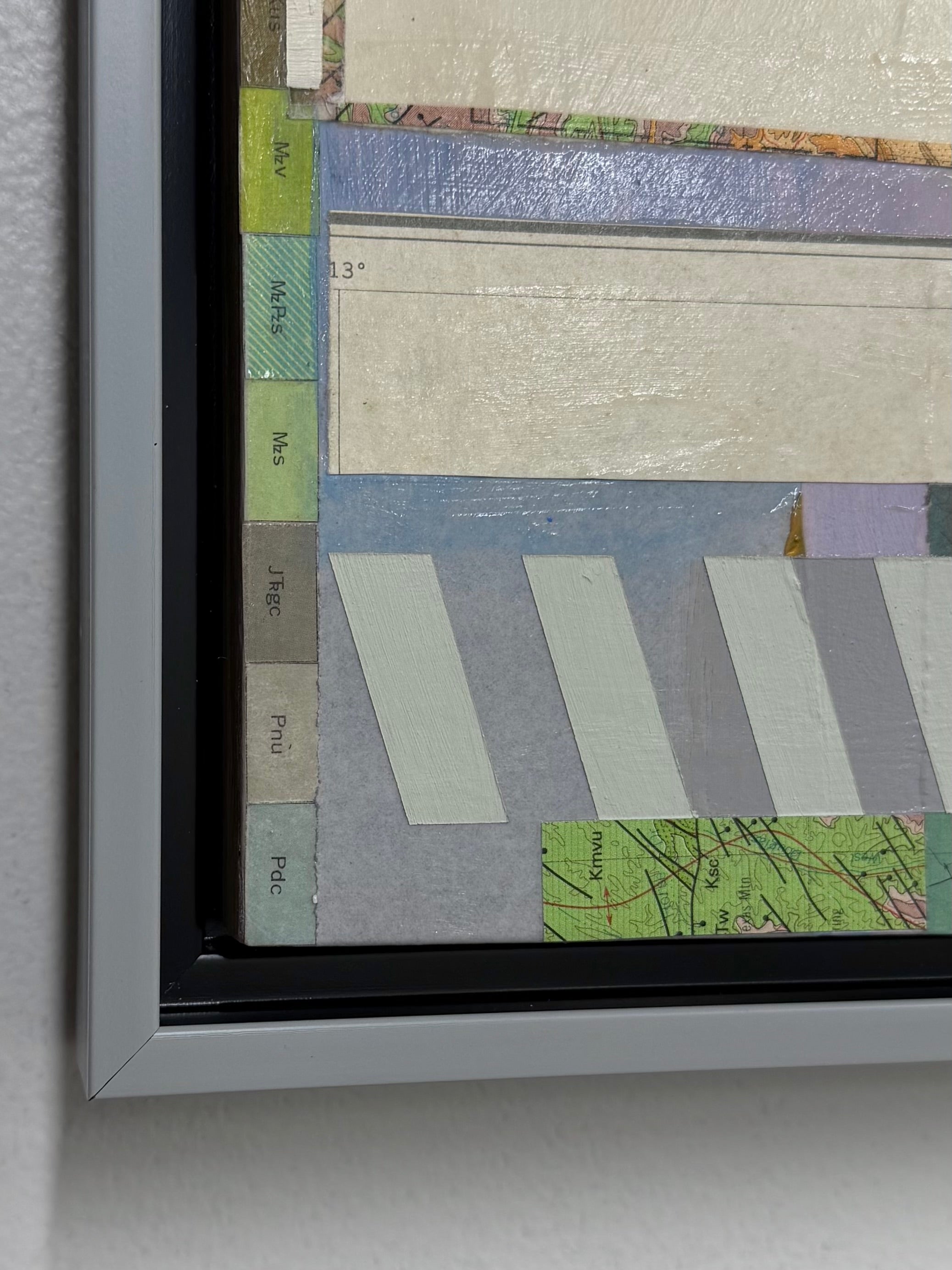 mixed media collage on panel, framed in silver floater frame